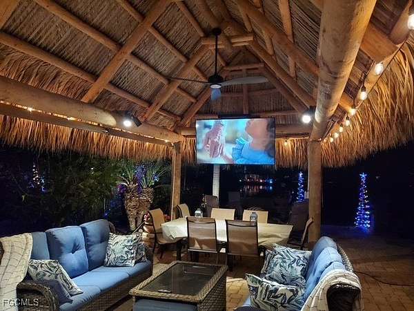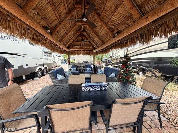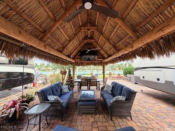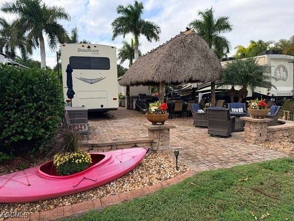 This lakefront lot is very unique as the lot can host a Class A, Class C or a 5th Wheel. The lot features an amazing 12 x 24' tiki hut that keeps you cool under. The Tiki Hut is complete with hurricane lights, twin ceiling fans, side spotlights, and four privacy drop-down shades. You can enjoy your favorite TV programs or movies under the Tiki on the Samsung 65 inch drop-down TV which could be raised or lowered as needed and still have spectacular views of the lake. The lot comes complete with an irrigation system, tropical trees, and additional landscaping for some privacy and if you'd like to cook out, you won't be disappointed with this large BLAZE stainless steel 32 inch grill allowing you to grill on. The fire magic refrigerator under the granite covered countertop will keep your beverages cool, the 8 foot granite countertop will give you plenty of room serve your food. Cleanup is very simple with just step over to your stainless steel outdoor sink. Guests can sit at the bar height granite covered top which features four stools. This lot will allow you to watch the sun coming up, but let's not forget the 8 x 15' Amazon finished Casita featuring plank vinyl flooring, an acrylic shower, a toilet, a bathroom sink and additional cabinet storage. There is a sliding pocket door that separates the bathroom from the open Casita space. There is a washer and dryer located in the main area of the Casita. An on-demand hot water heater and mini split air conditioner/heater keeps the temperature at the desired comfort level. All improvements on this lot have been permitted Stop in to see all the features this Lake Lot will offer you.