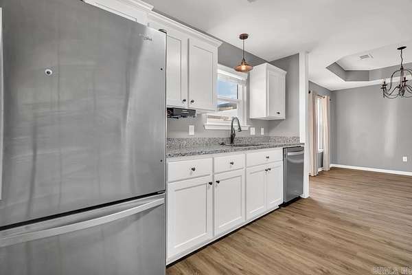Est $1,595/moHill Creek Estates! Many updates were done to this home approx. 5 years ago including new central heat/air, new vinyl plank flooring, fresh interior paint, all new light fixtures, granite countertops and stainless steel appliances in kitchen and both bathrooms have been totally updated! Split floor plan. Concrete patio out back with pergola for outdoor BBQs and enjoyment! Large backyard. Water heater is approx. 6 years old and roof is approx. 10-11 years old. There's also a 24x30 workshop that has electric, water and is insulated.