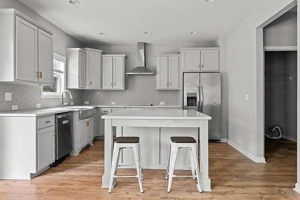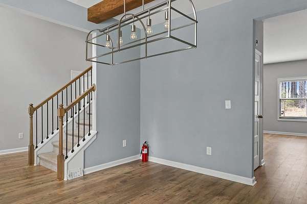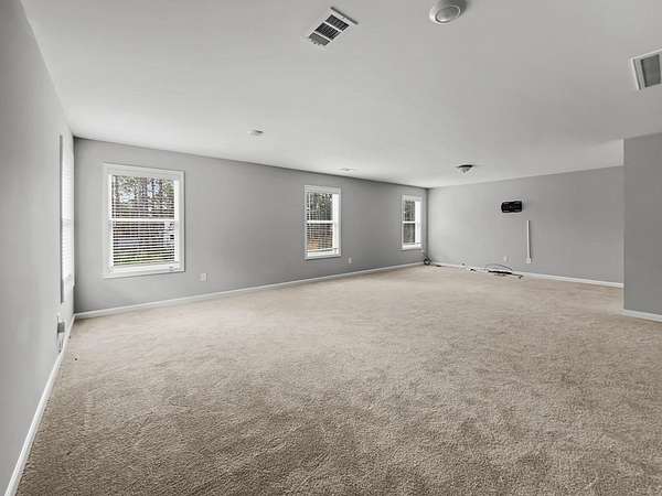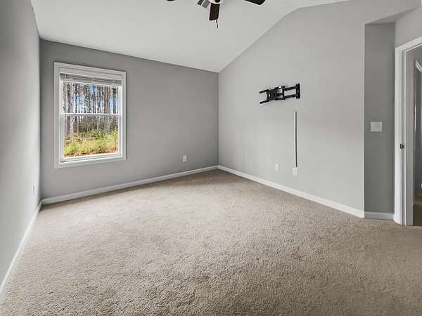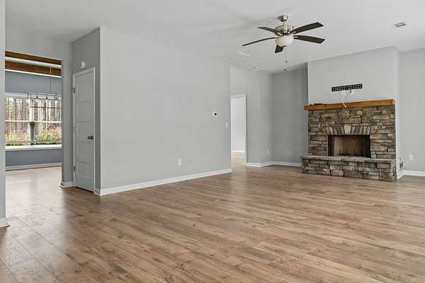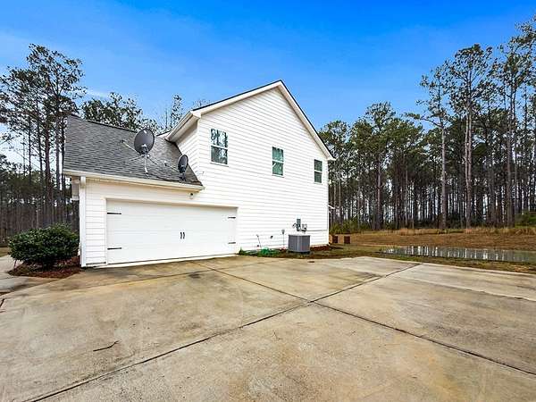 This spacious home sits on 5.02 wooded acres and offers both privacy and room to grow. Tucked inside a scenic, wooded setting, the home features an open layout, plenty of flexible living space, and smart updates for modern comfort. Step into the foyer and find the laundry room to the right and pantry to the left, just before entering the well-equipped kitchen. The kitchen features an island, stainless steel appliances (oven, cooktop, microwave, refrigerator, and dishwasher), and opens seamlessly into the main living area with a wood-burning fireplace and a half bath nearby. A separate dining room and extra storage closet complete the main floor common space. The owner's suite is located on the first floor and includes double vanities, a soaking tub, a standing tile shower, walk-in closet, and a private water closet. Upstairs, enjoy an open flex area perfect for entertainment, work, or study, along with three additional bedrooms-each with walk-in closets. A bonus room provides the option for an extra bedroom or office space. A second full bathroom upstairs includes double vanities and a tub/shower combo. One bedroom even includes a smart lock, great for future rental or guest use. Outside, the home offers a rear patio and a large concrete pad that could support extra parking, storage, or a gazebo. A well pump is located to the left of the yard and the septic system is positioned at the front, near the owner's suite. The exterior is built with Hardie board siding and stone accents, and the roof is a composite-style. A full gutter system wraps around the house. Internet is already wired via Starlink, and the home is on a monthly termite bond.