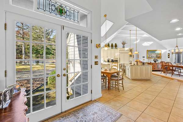 Experience the waterfront allure of Punkhorn Point! Sited on 1.78 Acre lot, This beautiful Contemporary home has water views from every room. Enjoy boating from your own private dock. The first floor primary suite includes hardwood floors, cathedral ceiling, walk-in closet with skylight and an elegant bath with whirlpool tub and full tiled shower. The home features 3 Additional bedrooms, first floor office, sunken living room, dining room with fireplace, family room with beautiful built-ins with a wet bar and refrigerator as well as a fireplace and a comfortable screened-in porch. The traditional gourmet kitchen features skylights, cathedral ceiling, Wolf appliances, granite countertops and Sub Zero refrigeration, as well as a lovely breakfast nook. There is an expansive mahogany deck to relax or entertain all summer long! South Cape Beach and Mashpee Commons are close by. This private, yet convenient location is perfect for all your Cape Cod needs!
