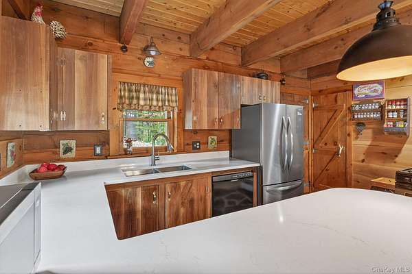 Inside, the story unfolds through wide plank pine floors, newly refinished to reveal their golden grain, and black walnut cabinetry so artful it feels carved from memory. The kitchen is a thoughtful blend of rustic and refined with quartz countertops, a fingerprint-resistant French door refrigerator, and a layout that invites connection. A cozy wood stove anchors the first floor living space, perfect for snowy mornings or golden-hour gatherings.