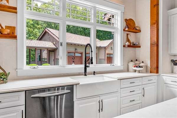 Experience elevated mountain living in this breathtaking Craftsman-style home, offering PANORAMIC views from every level. With THREE expansive decks, each floor seamlessly blends indoor and outdoor living. The updated kitchen is a showstopper with freshly painted cabinetry, new hardware, stunning ceiling-height tile backsplash, wood beams, open shelving, and beautiful new countertops. A custom walk-in pantry provides ample storage with built-in cabinetry and shelving. The kitchen opens to a breakfast area with direct access to a view-filled deck, and a formal dining room featuring elegant coffered ceilings.