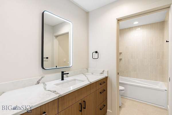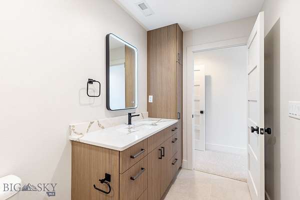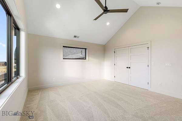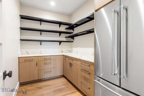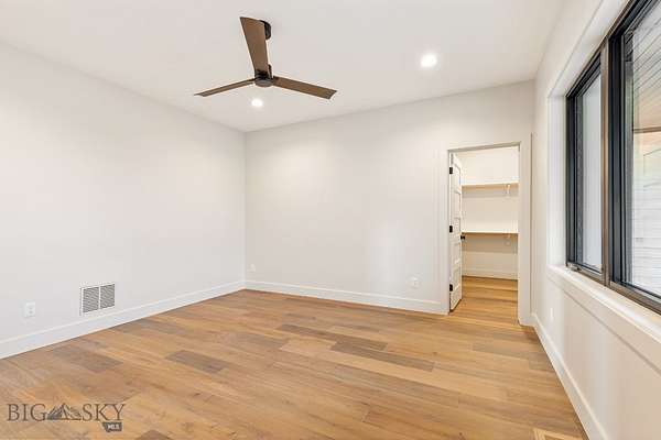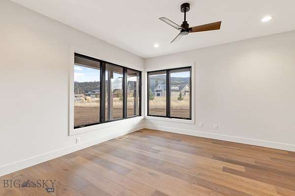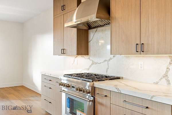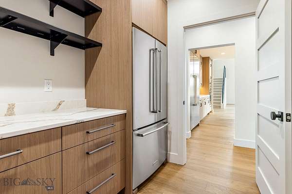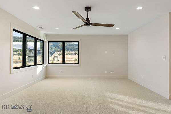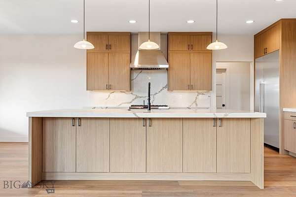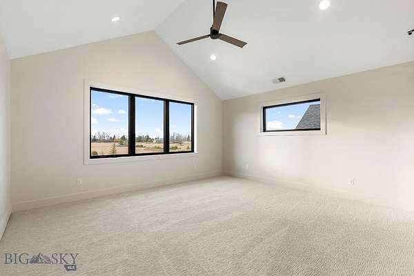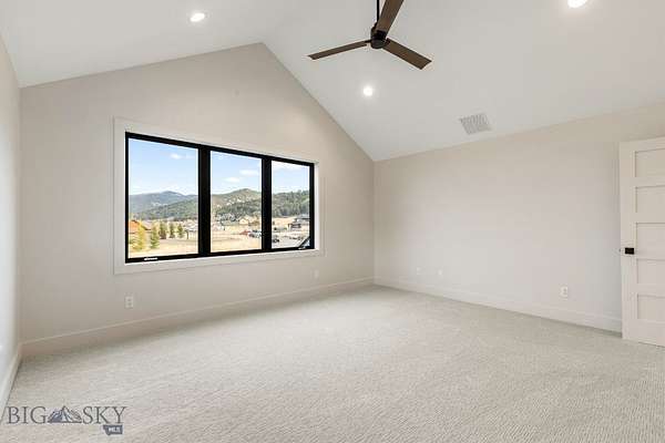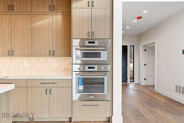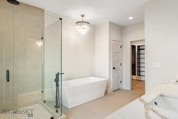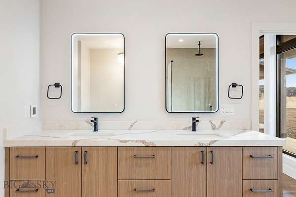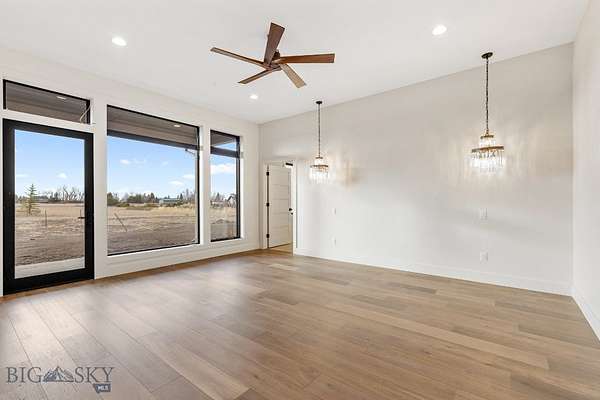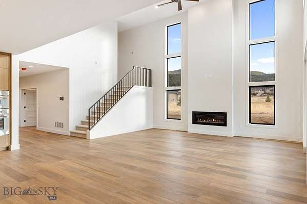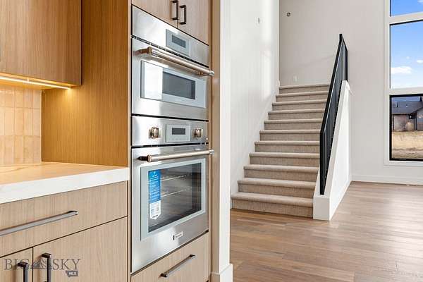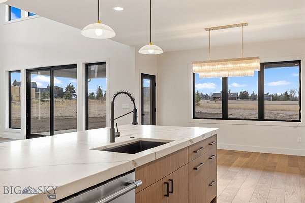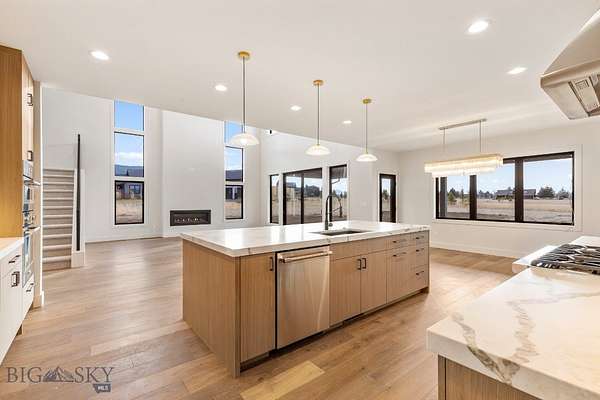 Set in Hyalite Ranch and positioned beside 8.86 acres of subdivision open space and trail systems, this home delivers expansive eastern and western views with a modern layout built for real entertaining and real life. Offering 5 bedrooms, 4 bathrooms, and 4,187 SF of finished living space, the floorplan is bright, intentional, and loaded with the kind of function buyers pretend they don't care about until they see it. The main level is anchored by a soaring great room with a gas fireplace and walls of glass that pull the landscape into the living space. The kitchen is equal parts statement and workhorse with a Thermador appliance package (gas range, double ovens, refrigerator, dishwasher), quartz surfaces with a quartz backsplash, and a large island designed for gathering. A walk-in pantry adds serious capacity, including space for a secondary fridge/freezer setup and storage that actually keeps counters clear. Finishes throughout are elevated and intentional, including designer lighting selections sourced from brands such as Arhaus, bringing a polished, curated feel that sets this home apart from the usual "builder-basic" look. A standout flex feature is the main-level office with a closet, making it a true bedroom option when needed. The owner's suite is a genuine retreat with a custom closet system and a spa bath featuring in-floor heat, because stepping onto cold tile in Montana is a cruel joke no one asked for. Utility spaces are elevated here: the mudroom is a high-end gear gallery with an exceptional amount of built-in storage for coats, boots, bags, and all the "where do we put this" items. The laundry room is oversized with abundant linen storage and ample folding and staging space, the kind that makes daily life smoother instead of chaotic. And then there's the garage situation, which is frankly ridiculous in the best way: a 2-car garage (800 SF, 32' x 25') plus an RV garage bay (682.5 SF, 39' x 17'6"), giving you space for vehicles, toys, tools, and the lifestyle that comes with them. HOME COMES FULLY LANDSCAPED AND SHALL BE INSTALLED WHEN WEATHER PERMITS.