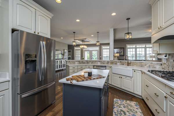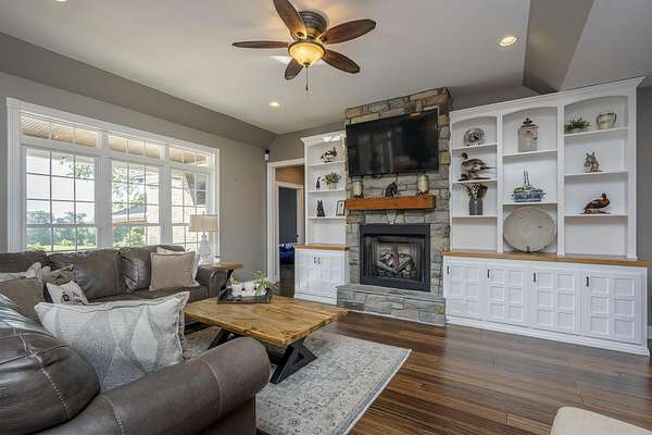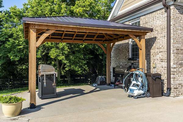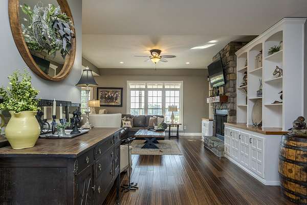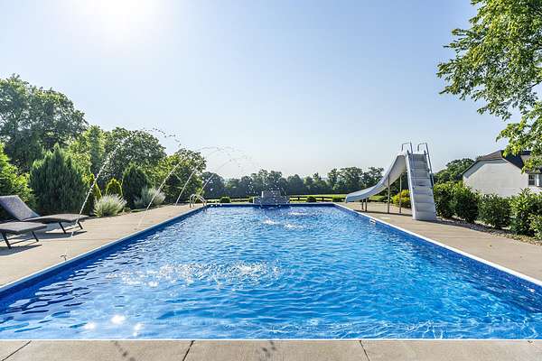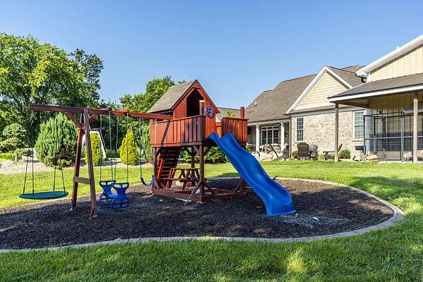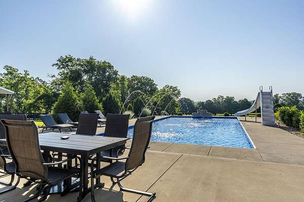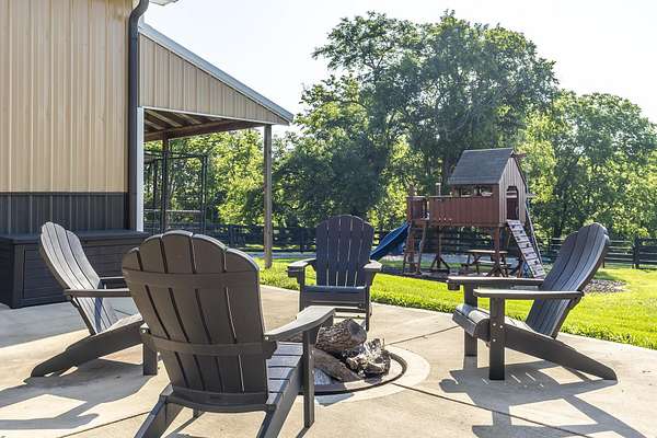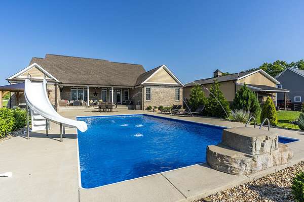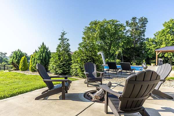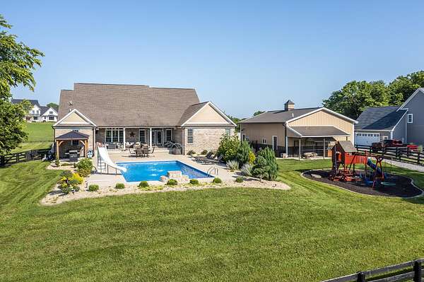 Here is your chance to own a slice of Kentucky with this Mini Farm in The Reserves at Chrisman Mill. Enjoy country living while benefiting from the amenities of an upscale neighborhood. This luxury, sprawling custom home, built in 2015, is strategically located on 5 Acres backing to the KY River. Enjoy breathtaking sunrises with views of fog rolling over the hills. The main level of this home spans 2,757 sq ft and offers a beautifully designed layout featuring solid hardwood floors throughout. It includes a spacious open-concept kitchen, dining area, and living room with a stunning stone feature, along with a dedicated office space. The luxurious first-floor master ensuite is accompanied by three additional bedrooms and two full bathrooms. Practicality meets style with a custom laundry room equipped with abundant cabinetry, a drop zone, and a built-in dog wash for convenience. Upstairs, you'll find 567 sq ft of finished space that includes a cozy movie theatre room, perfect for entertainment, plus a walk-in attic with 1,060 sq ft of unfinished space, offering the potential to expand and customize to your needs-ideal for adding bedrooms, a studio, or a private office. The finished basement adds another 971 sq ft and features a welcoming family room with a bar, a versatile flex/bedroom space (note: no egress window), a playful kids' room with a built-in rock wall, and a full bathroom, making it a fun and functional area for guests or everyday living. Outdoors, the home continues to impress with a gorgeous covered patio and a heated saltwater liner pool (installed in 2020, 3' to 5 1/2' deep) with a new pump and a dedicated pool bathroom. There's also a convenient side grilling/cooking area and a fully fenced backyard-perfect for pets. The detached 30'x40' garage/workshop features 10' tall doors, 12' ceilings, climate control, and its own electrical meter-ideal for hobbies or business use. Additional outdoor highlights include fenced-in, horse-ready pastures with a run-in shed, a kids' playground with rubber mulch, and professionally manicured landscaping complete with a cozy firepit area. Take advantage of relaxing country living while still enjoying amenities like Fiber-Optic internet, Uber, DoorDash, and Instacart grocery deliveries right to your doorstep! Conveniently located minutes to Nicholasville with grocery, restaurants, gym, shopping, medical, and more. Only 20 Minutes to Brannon Crossing or Tates Creek Center in Lexington for more options. This stunning property offers luxury living with space to grow, entertain, and enjoy nature. Perfect for those who crave both convenience and serenity.