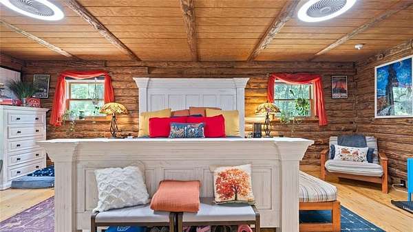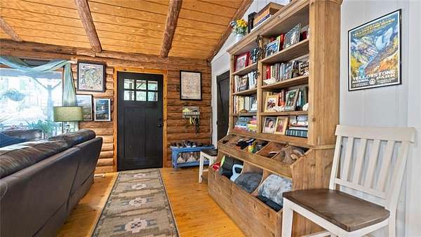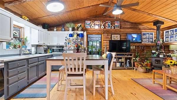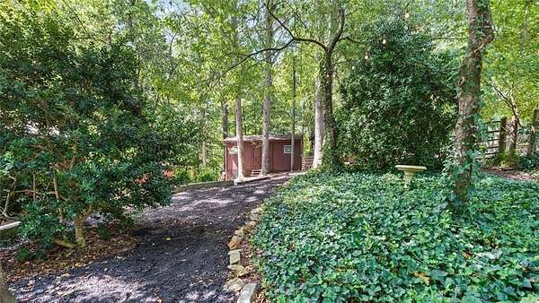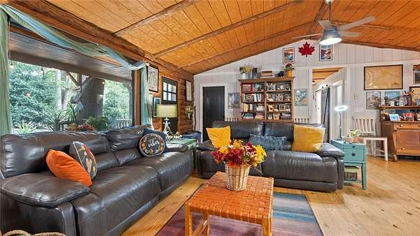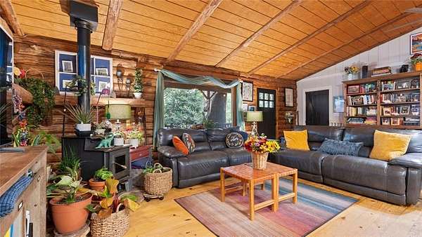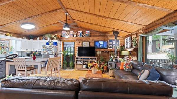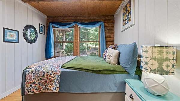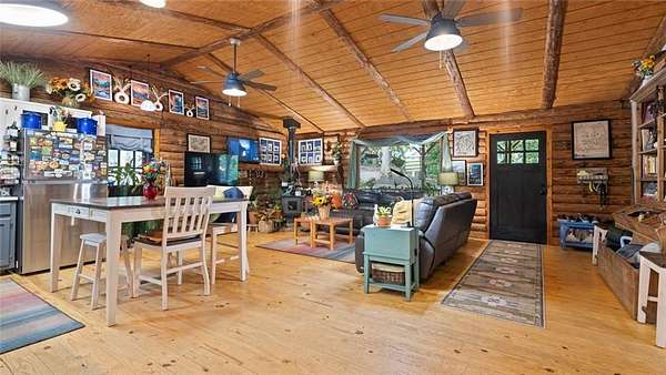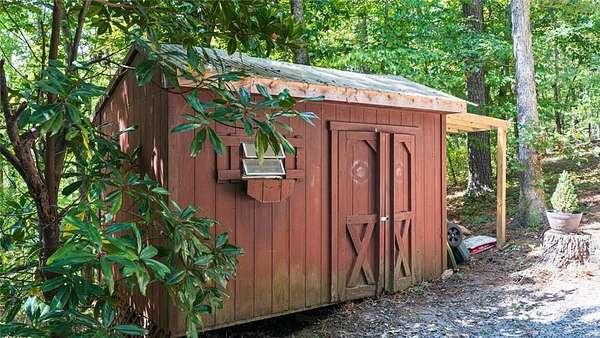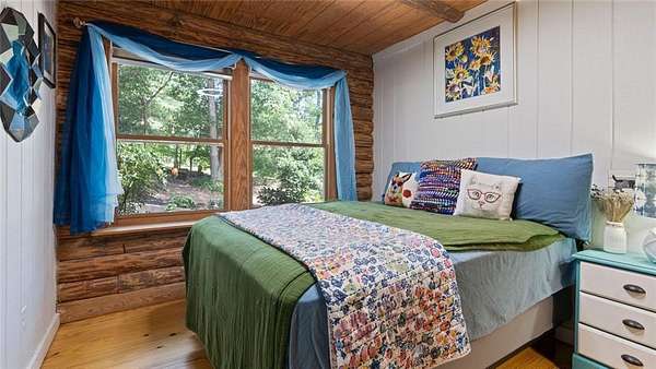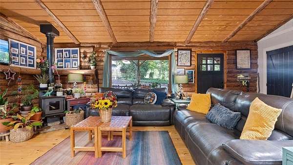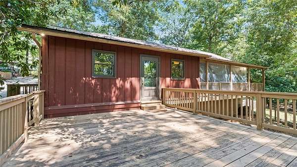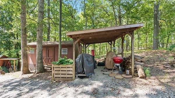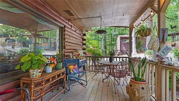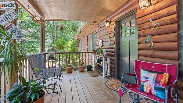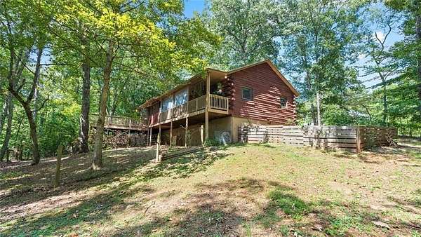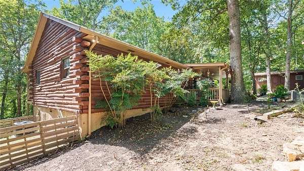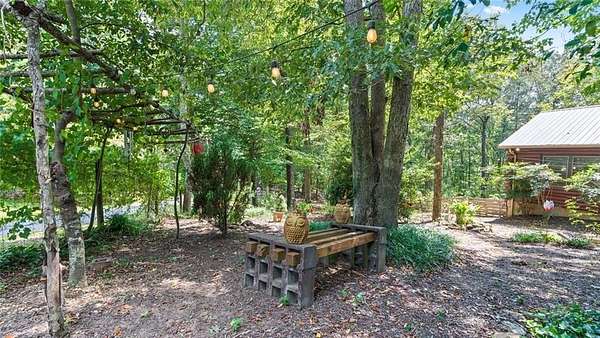 Escape to this enchanting renovated Log Cabin cottage situated minutes from Reinhardt University on 5 private wooded acres! Get away to your own mountain like retreat in this charming 2 bedroom 2 bath open concept home, complete with 2 new bathrooms and new kitchen. The energy efficient structure is an integrated log Cabin design with metal roofing and new HVAC system and beautiful wide plank pine flooring. The main area around the house is fenced and the beautiful natural setting, enhanced with flowering landscape plantings and lighting, leads to the large covered rocking chair front porch. Enter the spacious great room which is the heart of the home, with vaulted ceiling, open kitchen , sitting room with cast iron wood burning stove and dining area. Main hallway leads to secondary bedroom and new full bath with custom barn door. New owner's suite with spacious bedroom and sumptuous new full bath with soaking tub, and separate shower. Back hallway includes laundry room, built in shelving for pantry and storage, back door leads to huge back deck overlooking peaceful wooded back yard, and additionally a long side porch perfect for morning coffee and relaxing evenings. There are 3 separate outbuildings that serve the property. The first is an open covered grilling and smoker structure, great for the outdoor gourmet. The second is a large storage building with space for all you storage needs, and the third is a well equipped planting shed with clear ceiling panels to allow daylight for garden plantings. Completing this amazing property is a flower and vegetable garden area with wood pallet fencing. With 5 absolutely beautiful wooded acres, there are endless possibilities that make 502 George Gray Lane the perfect property for exceptional family living and entertaining!
