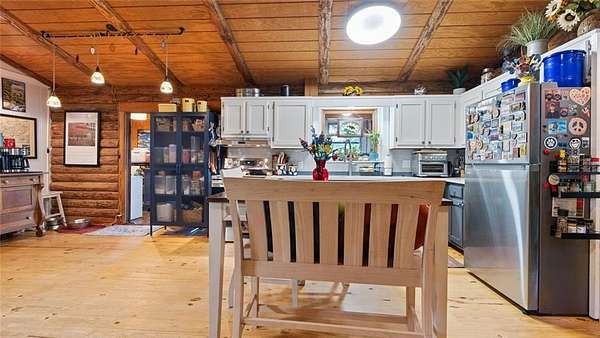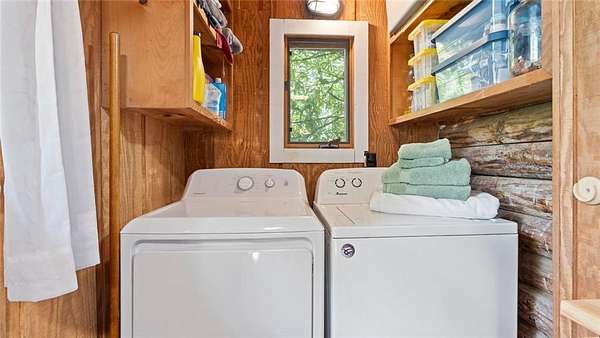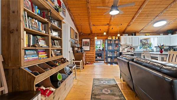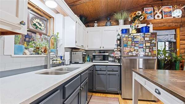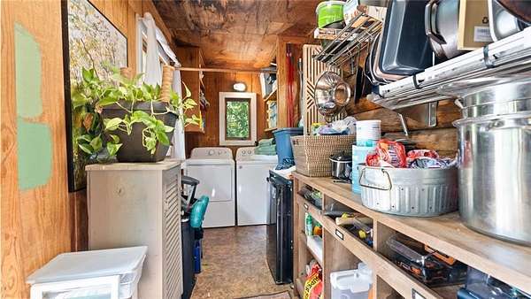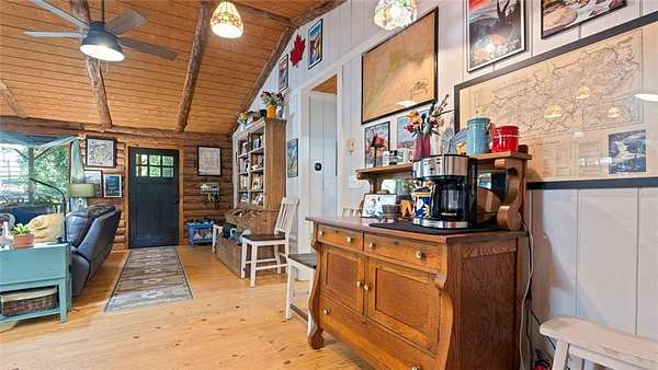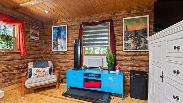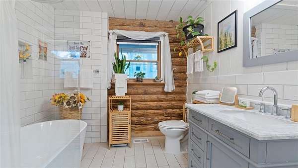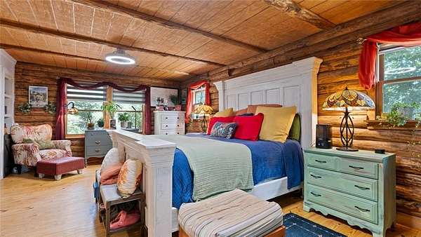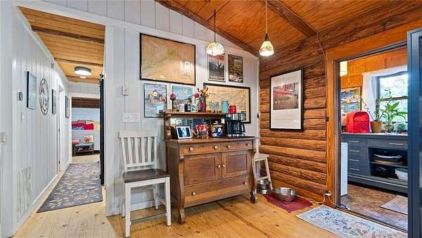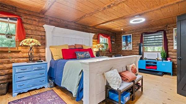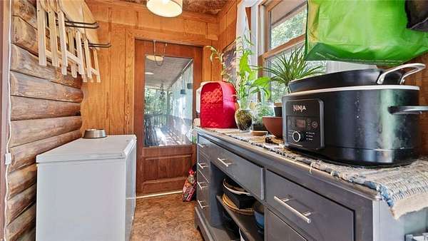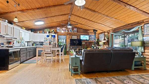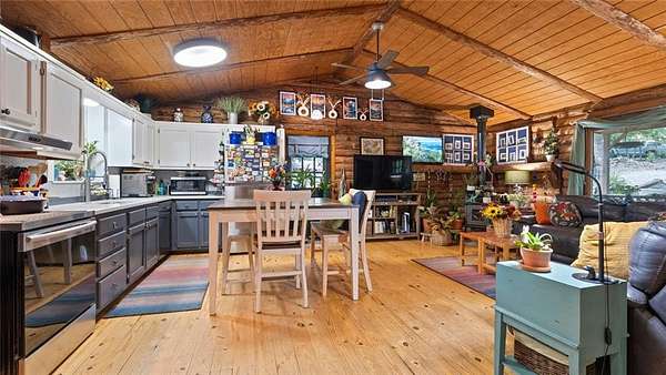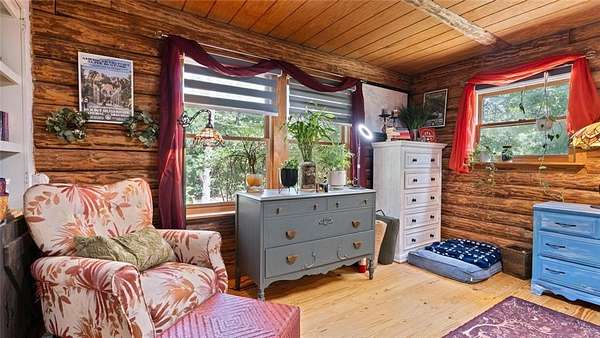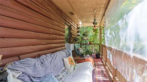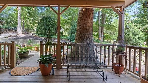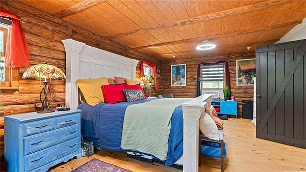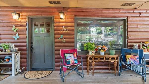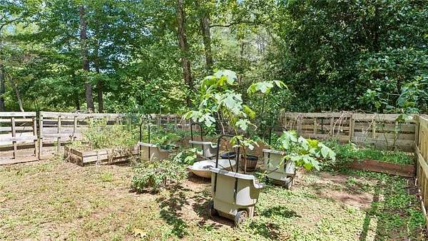 Escape to this enchanting renovated Log Cabin cottage situated minutes from Reinhardt University on 5 private wooded acres! Get away to your own mountain like retreat in this charming 2 bedroom 2 bath open concept home, complete with 2 new bathrooms and new kitchen. The energy efficient structure is an integrated log Cabin design with metal roofing and new HVAC system and beautiful wide plank pine flooring. The main area around the house is fenced and the beautiful natural setting, enhanced with flowering landscape plantings and lighting, leads to the large covered rocking chair front porch. Enter the spacious great room which is the heart of the home, with vaulted ceiling, open kitchen , sitting room with cast iron wood burning stove and dining area. Main hallway leads to secondary bedroom and new full bath with custom barn door. New owner's suite with spacious bedroom and sumptuous new full bath with soaking tub, and separate shower. Back hallway includes laundry room, built in shelving for pantry and storage, back door leads to huge back deck overlooking peaceful wooded back yard, and additionally a long side porch perfect for morning coffee and relaxing evenings. There are 3 separate outbuildings that serve the property. The first is an open covered grilling and smoker structure, great for the outdoor gourmet. The second is a large storage building with space for all you storage needs, and the third is a well equipped planting shed with clear ceiling panels to allow daylight for garden plantings. Completing this amazing property is a flower and vegetable garden area with wood pallet fencing. With 5 absolutely beautiful wooded acres, there are endless possibilities that make 502 George Gray Lane the perfect property for exceptional family living and entertaining!