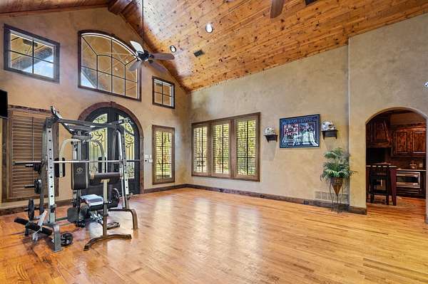 Recreation Center- A beautifully matched companion building of approximately 3,800 sq. ft. serves as the ultimate private recreation destination. Featuring 2 bedrooms and 2 full bathrooms, this facility includes a fitness center, indoor racquetball court, full kitchen, spa, and a walk-in gun room and safe. An outdoor grill station and lighted tennis and basketball court complete this extraordinary recreational offering.