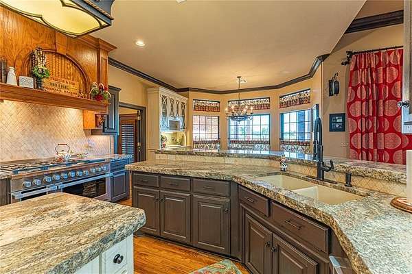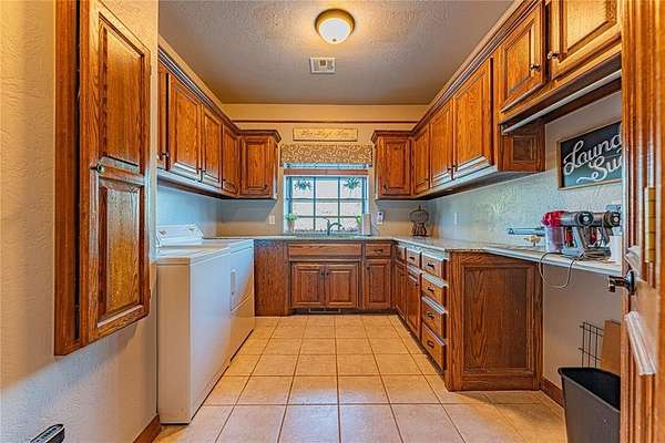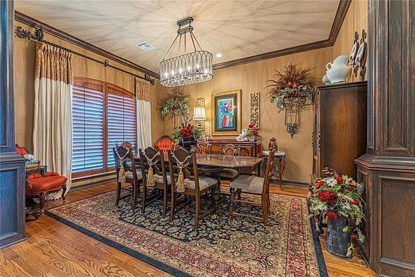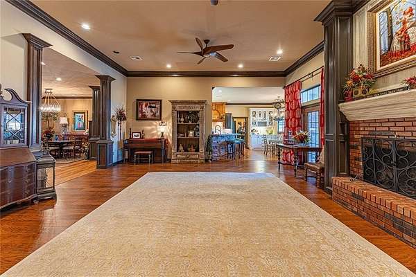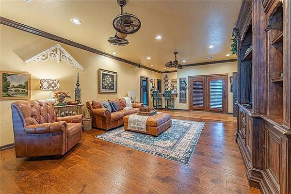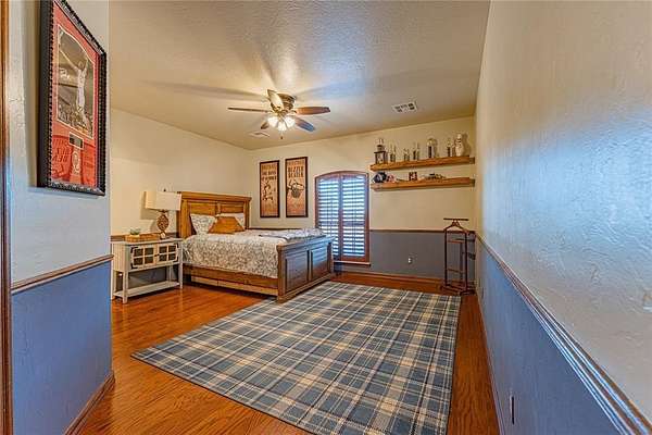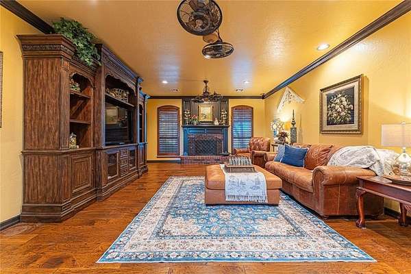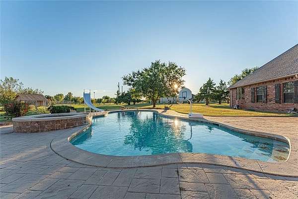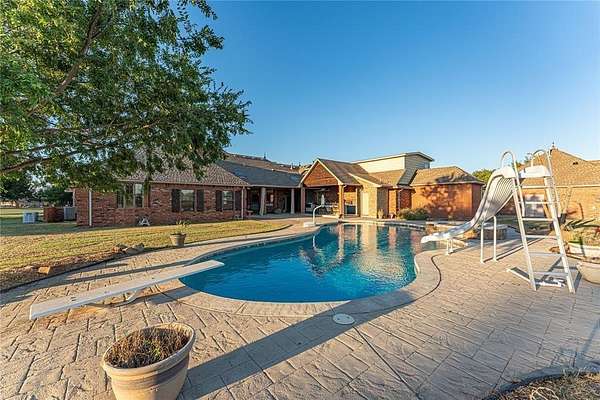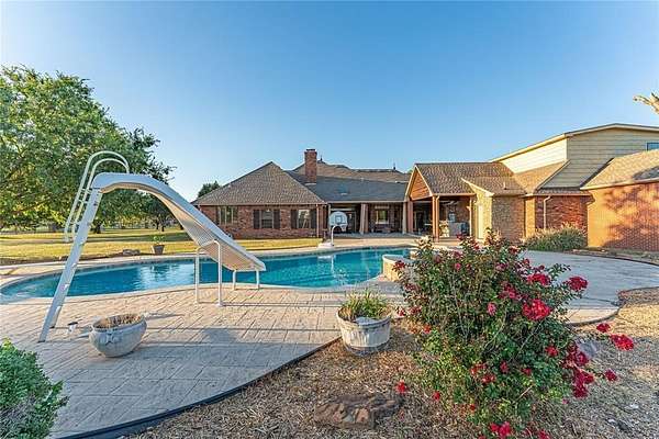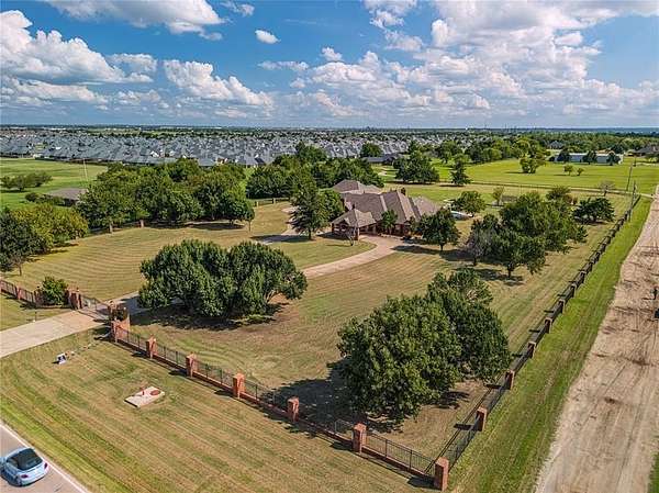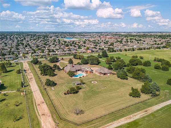 Don't miss out on this large estate with a separate guest house & finished secondary building space great for a home-based business or man cave. This stunning estate on 5 fully fenced & gated acres is in a highly desirable & convenient location, sitting just off of SW 164th between Western & Santa Fe. This location makes it very convenient to Norman, Moore & OKC - minutes from interstates, shopping & amenities but offering the tranquility of country living. The main home provides for elegant living creating a great space for entertaining with 5,123 sq feet of beautifully crafted living space featuring soaring ceilings, stunning crown molding, gorgeous granite countertops, wood floors, rich woodwork, 3 separate living spaces plus an office & dedicated sitting in the master, 3 fireplaces, a formal dining area, additional dining off the kitchen, 5 total bedrooms, including an exceptional primary bedroom that is an oversized retreat. This property also comes with its very own guest house, perfect for elderly parents, college kids, or for guests, with a beautiful functioning kitchen area with sink, dishwasher & microwave, open living & bedroom space, a wonderful adjoining bath with accessible features, granite countertops, & built-in desk. An additional room is also located in guest quarters, great for a home gym or office space, all totaling around 1,000 additional sq ft of space. (Making the total sq footage in the listing) 5 car garage plus lawn equipment bay, making lots of room for cars & toys! Step outside to your own oasis of an outdoor living space with elegant covered patios, outdoor kitchen/grilling area, firepit, & a 40,000 gallon saltwater pool with diving board, slide & separate hot tub area with waterfall. All of this with an oversized walk-in storm shelter & whole-house generator, you'll be in good hands during Ok weather. With this city acreage, multiple living areas, incredible outdoor amenities, this home is perfect for grand living & entertaining.