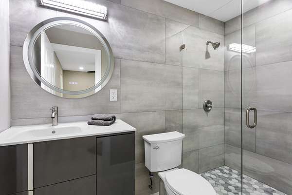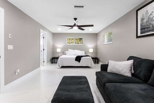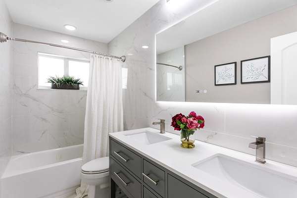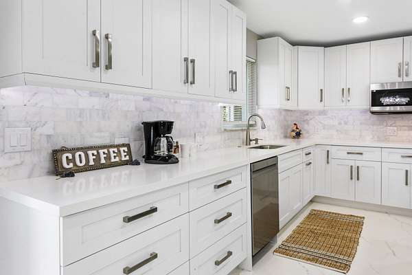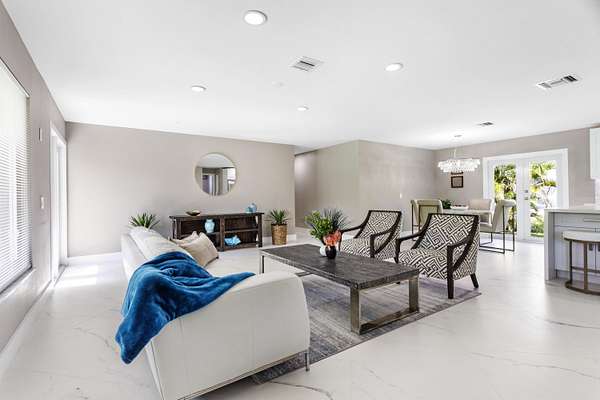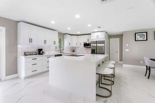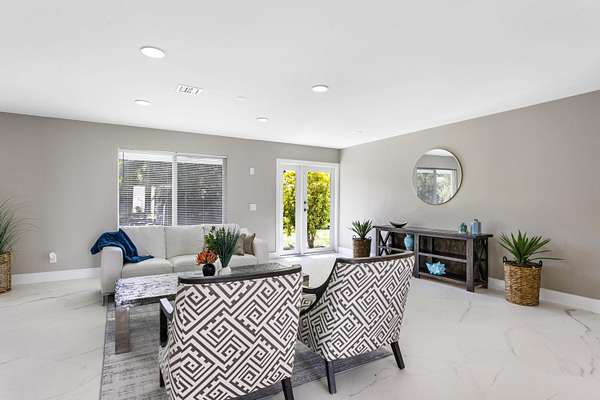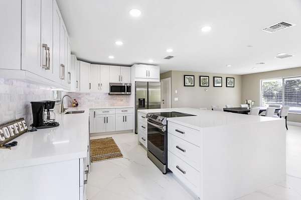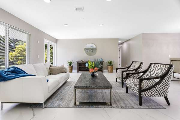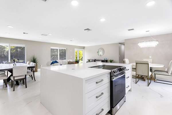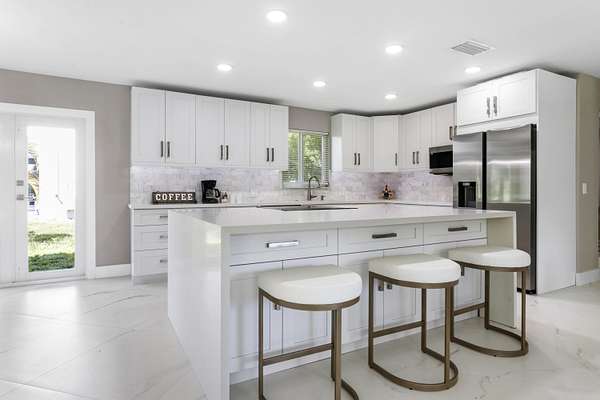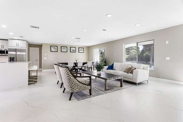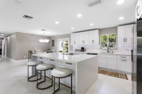 CBS fully renovated 4 BR, 3.5 BA, 2CG residence features open concept living, 8' ceilings with recessed LED lighting and smart home technology. 32x32 Porcelain Tile throughout highlights the spacious Living area with large windows, redesigned kitchen with quartz Island and Countertops, Carrera Marble Backsplash, solid Wood Shaker Cabinets and Samsung SS appliances. Spacious primary suite offers comfortable relaxing area and large closet space. Primary Bath has frameless glass shower and shower/tub combo. Additional Bedrooms share 2nd Bath with Double Vanity and Tub/Shower. A flexible en-suite bedroom/home office/den offers the ideal space for guests or work-from-home needs, plus a powder room.