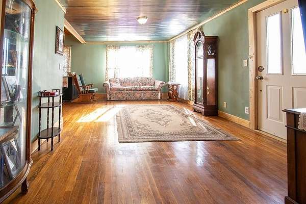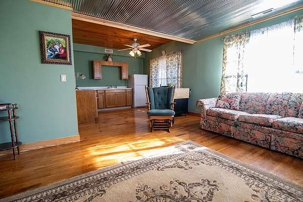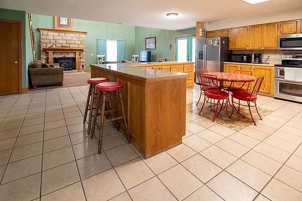 Rustic-style home located on Highway 94 in Rogers, situated outside city limits, on approximately 4.22 acres, offering more flexibility and fewer restrictions. The home features an open living area with vaulted ceilings, a stone fireplace, and abundant natural light, complemented by warm wood finishes throughout. The main kitchen offers ample cabinetry and counter space and flows into the living and dining areas. In addition, a rear area includes an electric cooktop and sink, providing flexible use as a studio or hobby space. A large detached shop measuring approximately 38x48 (about 1,824 sq ft) offers excellent space for storage, workshop, or multiple uses. Covered front porch, mature trees, and a peaceful setting with convenient access to Rogers