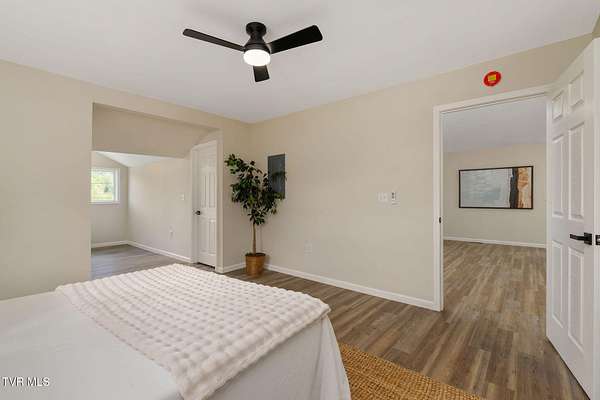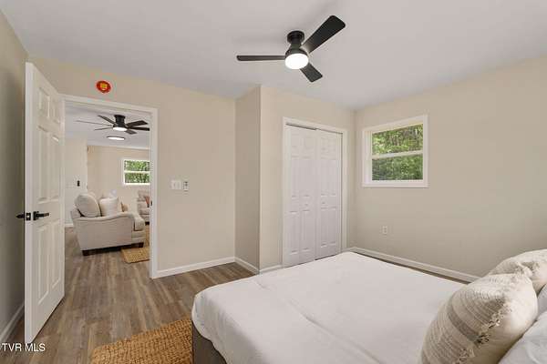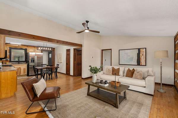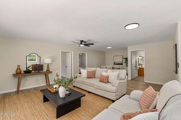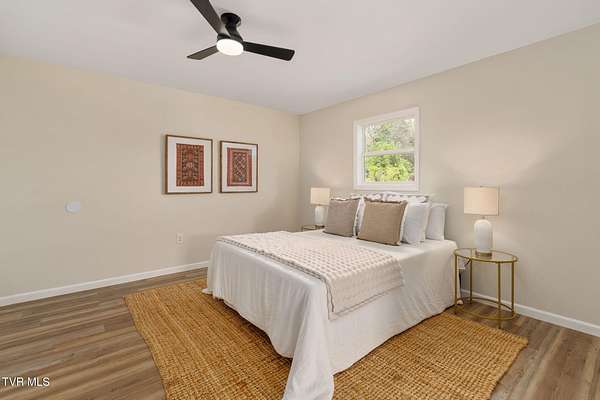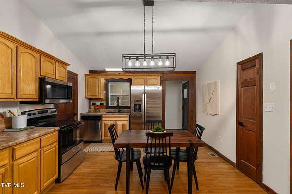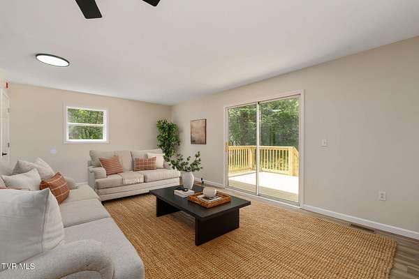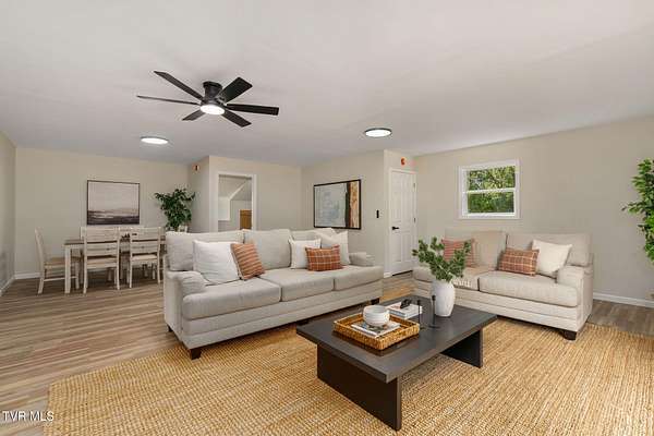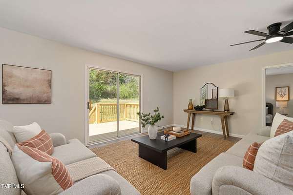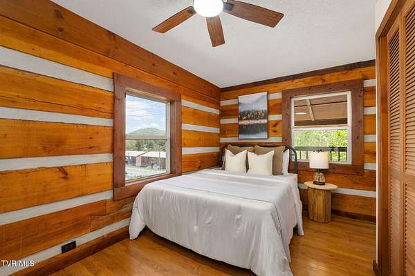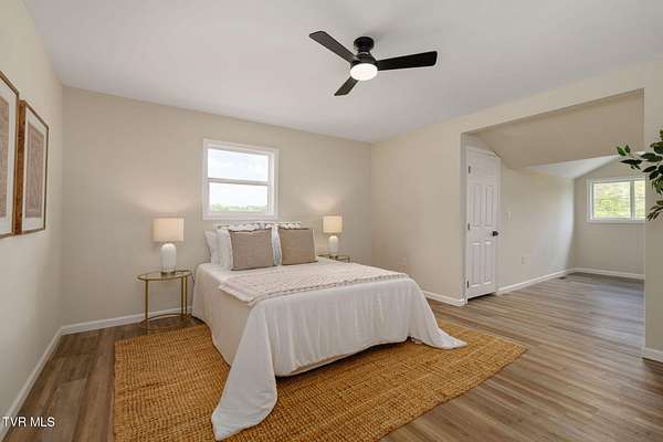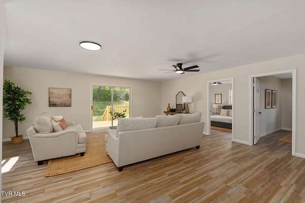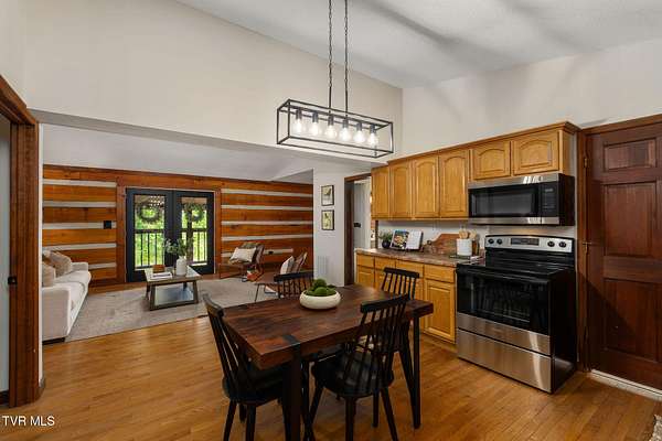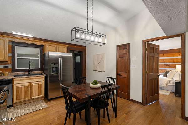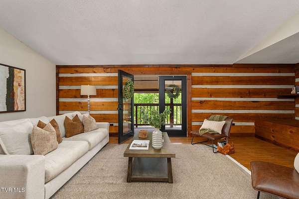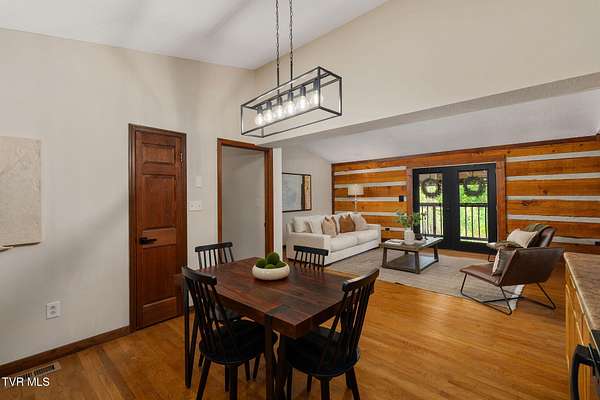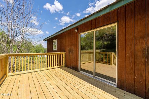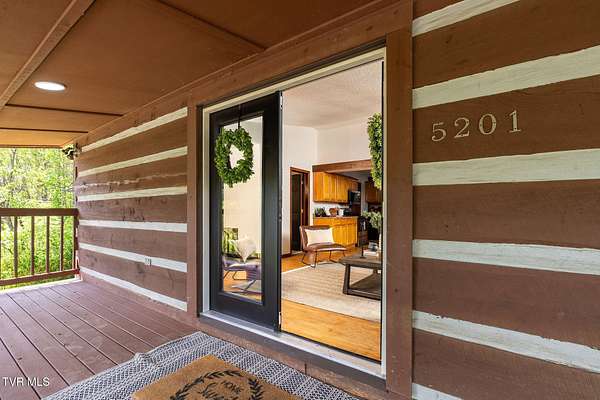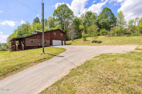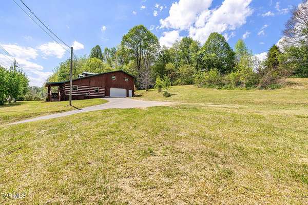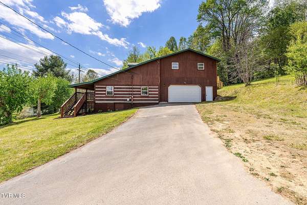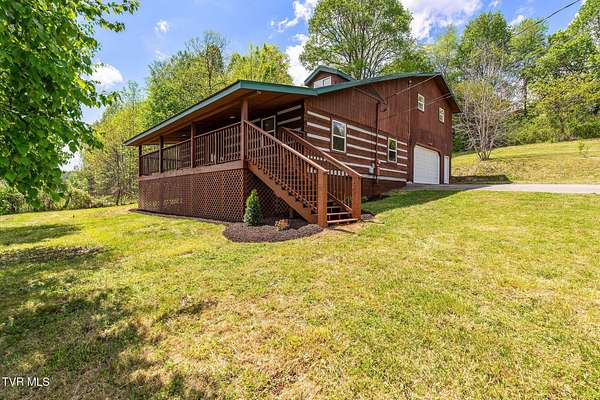 Set on 3.23 private acres just minutes from Johnson City, this stunning 2016 Sq Ft log style home offers the perfect blend of rustic charm and modern upgrades in a peaceful, scenic setting. A full length covered front porch spans the entire front of the home and captures beautiful valley views, creating an inviting space to relax and unwind. Step through the double glass front doors into a bright open interior with soaring vaulted ceilings, rich wood flooring, and exposed timber accents that bring warmth and character throughout the main living areas. The main level features an open concept design with a spacious kitchen complete with brand new appliances, two generously sized bedrooms, a large full bathroom, and a convenient laundry room located within the home. Upstairs offers an expansive second living area that opens directly to a private back deck overlooking the property, providing endless flexibility for a second family room, game room, or entertainment space. Two additional bedrooms with walk in closets and a full bathroom complete the upper level, creating an ideal layout for guests, extended family, or a potential separate living space. The oversized two car garage is massive and offers incredible space for multiple vehicles, a workshop, storage, or hobby use. The home is equipped with dual HVAC systems with one unit servicing the main level and a separate unit for the upper level, providing efficient and comfortable climate control year round. Recent upgrades include new luxury vinyl plank flooring throughout the upstairs, fresh interior paint, updated fixtures, and modern finishes that make this home truly move in ready. The acreage offers exceptional usability with a barn and plenty of open space to bring your vision to life whether it is for animals, recreation, gardening, or future improvements. The long asphalt driveway provides abundant parking and enhances the sense of privacy while still being conveniently located near town. This is a rare opportunity to own a spacious, beautifully updated home with land, versatility, and endless potential in a highly desirable location. Homes like this do not come available often and this one is ready to sell quickly.