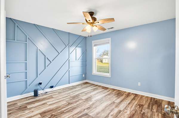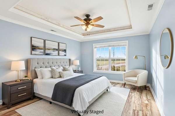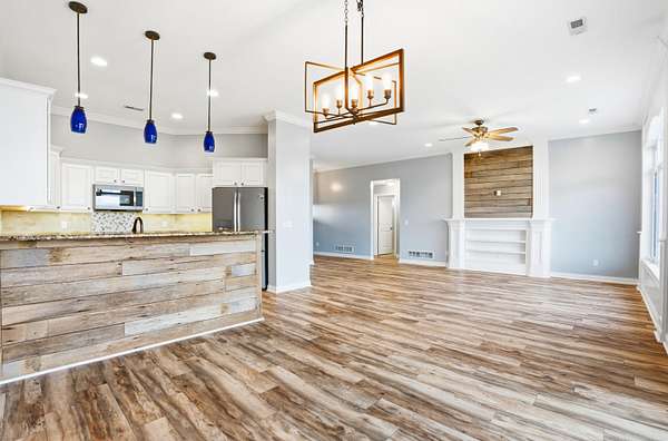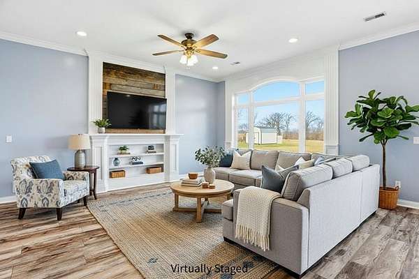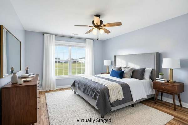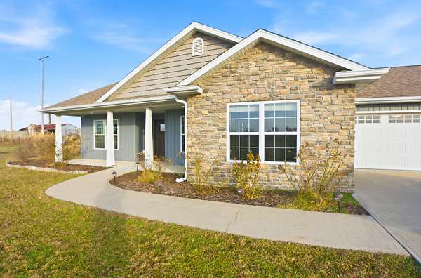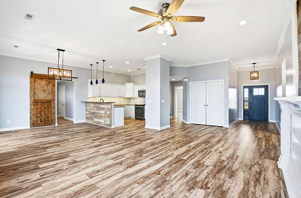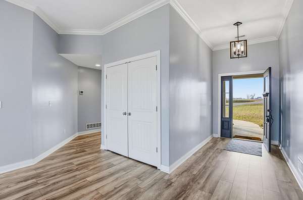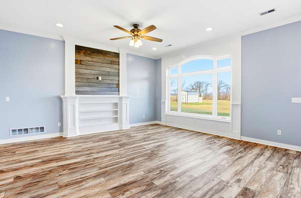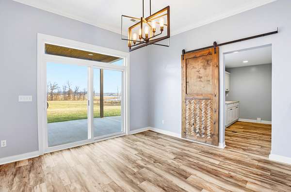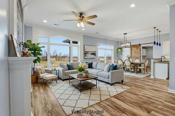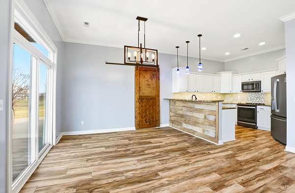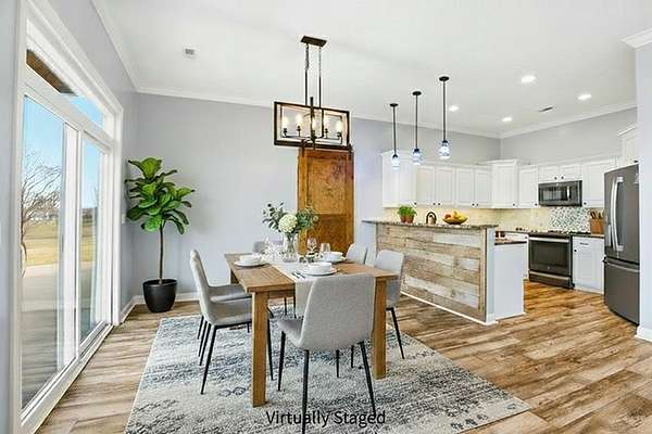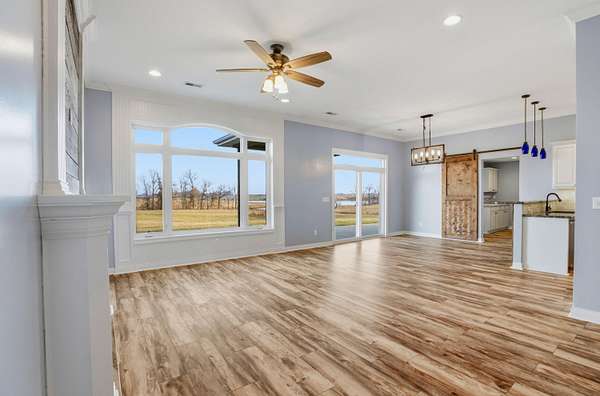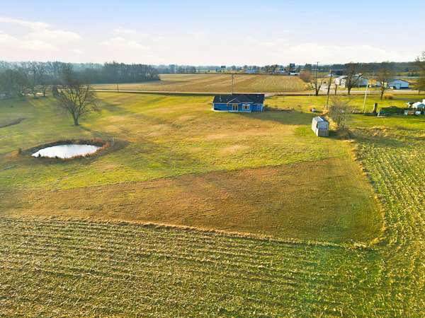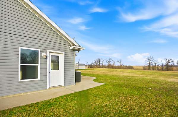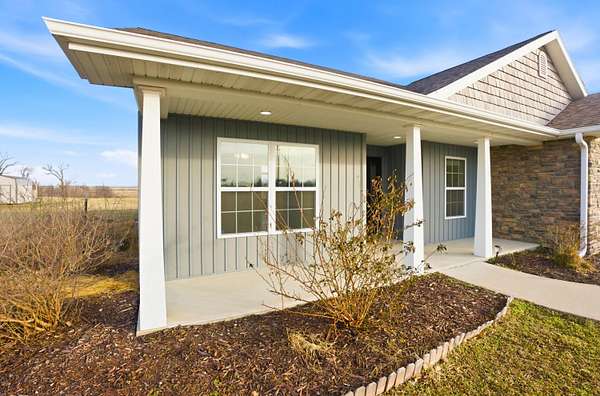 Set on 3.1 acres and backing to hundreds of acres of farmland, this 3-bedroom, 2-bath home built in 2016 offers rare privacy with peaceful lake views. Tall ceilings and large windows with transoms frame the scenery and fill the home with natural light, while the open floor plan keeps the main living areas bright and connected.The home features LVP flooring throughout, no carpet, granite countertops, and a layout designed to highlight the views from the back of the home. The primary suite includes a tray ceiling with accent lighting, a large walk-in closet, and a standout tiled walk-in shower featuring dual shower heads and a spacious, spa-like design that feels intentionally upgraded. A large laundry room provides additional storage and a utility sink.Outdoor living shines with a huge back patio, partially covered, overlooking the surrounding farmland, plus a sidewalk connecting the patio to the front driveway. A covered front porch adds even more usable space.