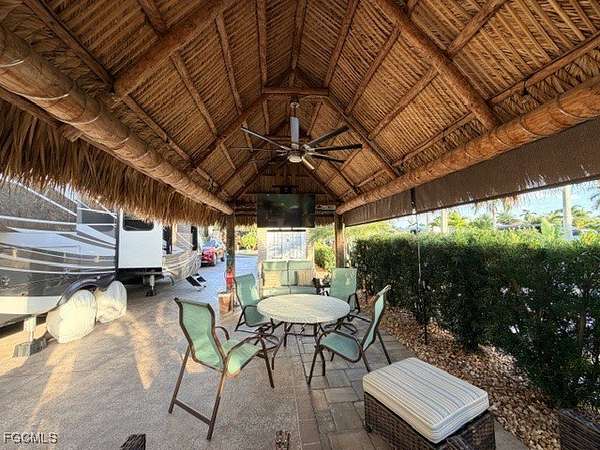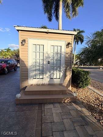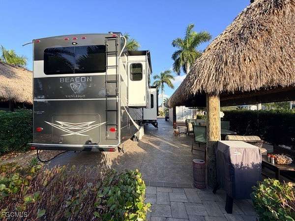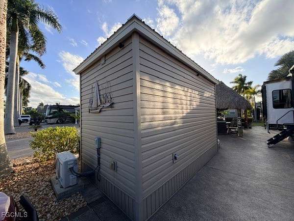 Lot 291 is east facing and is painted with a light bronze, flaked epoxy on the concrete. A 10 x 20' tiki hut is all decked out with Tiki lights, a super sized ceiling fan with a led rope lights wrapped around your tiki hut for an additional lights after dark. Some great features are side yard and rear patio pavers including a variety of plants surrounding the lot with miniature date palms, wild date palms, crane flowers, yews, pine magnolia, and a plethora of additional species. There's an 8 x 15' Amazon shed completely finished that features light grey waterproof plank flooring and a Maytag commercial technology stackable washer and dryer. The shed is drywalled, insulated and has ample electrical outlets. Included in the shed is LED ceiling lights, a pioneer mini split that cools and heats, a shower, a large stainless steel sink vanity with several drawers and a super sized vanity above the toilet that is a mirrored and has a electric Rheem hot water heater. The bathroom is separated by a privacy sliding door. The double doors of the shed have glass in them with inside door blinds for added light or privacy. This lot is very close to the community clubhouse which features many activities both inside and outside , a swimming pool, exercise room, laundry room, library, pool table room and outdoors is bocce ball, shuffleboard, pickleball courts, tennis court and cornhole bags area. This lot is priced for your southern occupancy in warm sunny Fort Myers, Florida Florida. Call for a private no obligation Tour.