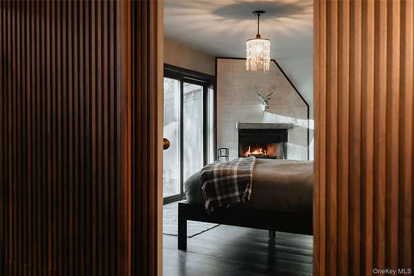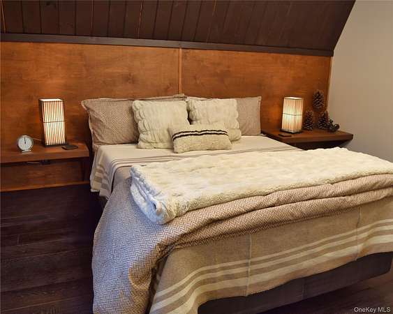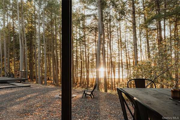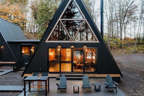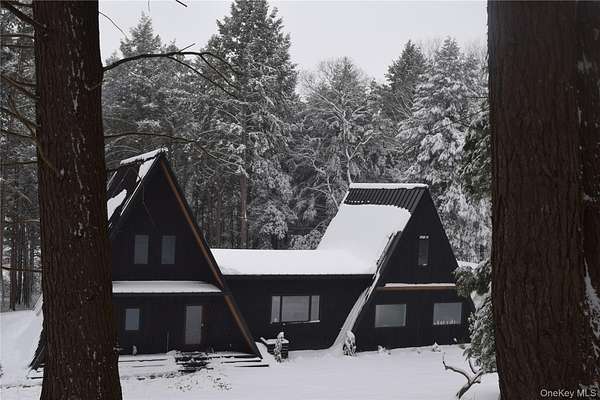 Escape to your own private woodland getaway in this striking double A-frame home, custom-designed by a local builder known for creating spaces rich in character and textures. Nestled on a secluded, lakeview-wooded lot, PerryWood exudes the charm and warmth of a classic A-frame, but delivers the space and comfort of a full-size home with 3 bedrooms and full baths, a chef's kitchen, 2 dining spaces, loft office, yoga studio, equipped gym, screen room, and two back decks. The large unfinished basement provides opportunity for additional expansion of living space. Built in 2021, Perrywood is offered with most of its furnishings which have been creatively curated to complement its unique design. Two hours from NYC and minutes to Bethel Woods Center for the Performing Arts. This is a lake "view" not lake "front" property-- there is NO RIGHT OF ACCESS to the private lake.