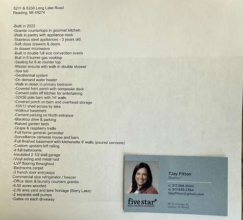 Dream big in this 2 1/2 yr old custom home. The footprint is 2440 sq ft and the liveable space is over 4000 ft, luxuriously finished, including a full finished walkout basement with a kitchenette and full bath. In the morning, fish for blue gills/bass from your dock and then retire to the woods in the afternoon to harvest your Turkey or Hillsdale County Trophy Deer. Or simply skip it all and create an amazing feast in the gourmet kitchen, or tinker in the 32x56 pole barn in your shop. This property holds 3-4 artesian wells that endlessly supply the Geothermal System that maintains whatever heat or air conditioning temps you desire. The full home Generac Generator maintains everything in the event the lights go out before you're ready. Every countertop in the home but two, are granite, including the pantry and laundry room. Appliances are residential but commercial size. The home has 3 large bedrooms each having big closets. There are 4 full bathrooms and the Master insuite resembles an upscale spa with a double walk in shower. No worries the on-demand water heater and softener are owned by the homeowner and stay. Several gardens on the property flourish with everything from blueberries to grapes and tomatoes to squash and if your table fair calls for flowers you'll have plenty to choose from. Entertaining is easy on the 50ft long front covered porch or on the cement patio out back sitting around the fire pit. The pics are great but you really need to stop by and check out the amazing views and the craftsmanship put into this dream. I challenge you to find the secret hidden chef's pantry room and appliance nook. Don't forget to check out the custom loft railing upstairs while you look out over the lake. The 3-stall attached garage is in addition to the pole barn and the lakeside storage shed--all nesting on 8.65 acres. A list of amenities is included in the pics. Hurry, this one will not last. Tax ID for lake parcel 30100211000162174