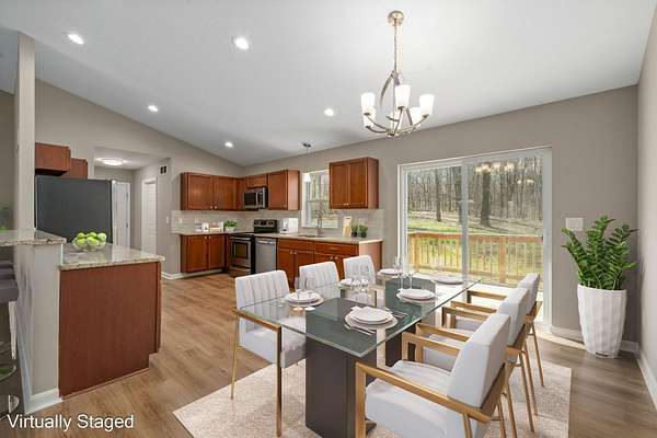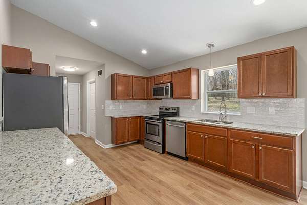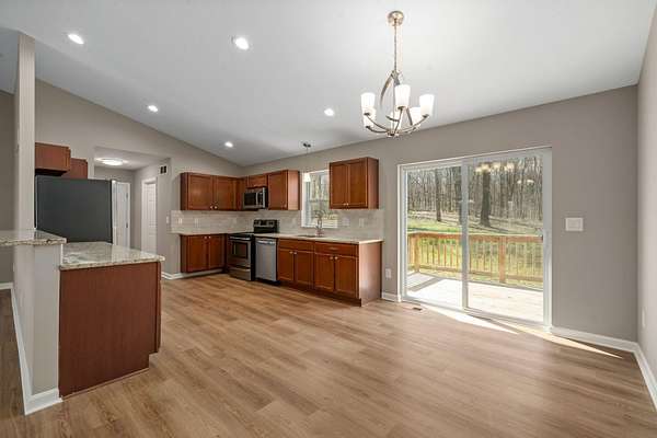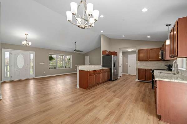 Welcome to this beautifully reimagined 3-bedroom ranch on 5 private acres, where modern luxury meets peaceful country living. Fully renovated from top to bottom, this home offers exceptional style, comfort, and functionality. The main level features all new flooring and carpet, fresh paint, updated lighting, and modern finishes throughout. The kitchen has been tastefully upgraded with a new backsplash, faucet, and cabinet hardware, creating a clean, contemporary feel. Bathrooms have been refreshed with new vanity tops, fixtures, mirrors, shower doors, and toilets, offering a spa-like experience. The fully finished walk-out lower level adds incredible versatility with 2 additional bonus rooms, a full bath, washer/dryer hookup, and a stylish wet bar with backsplash--perfect for entertaining or multi-generational living. Additional updates include new ductwork and sump pump. Outside, enjoy the privacy and space of 5 acres with fresh landscaping, a newly graveled driveway, updated front door hardware, new garage door openers with keypad, and a serviced septic system with new aerator and cover. A rare opportunity to own a turn-key, fully updated ranch offering luxury, space, and convenience.