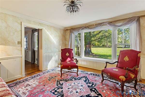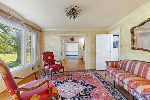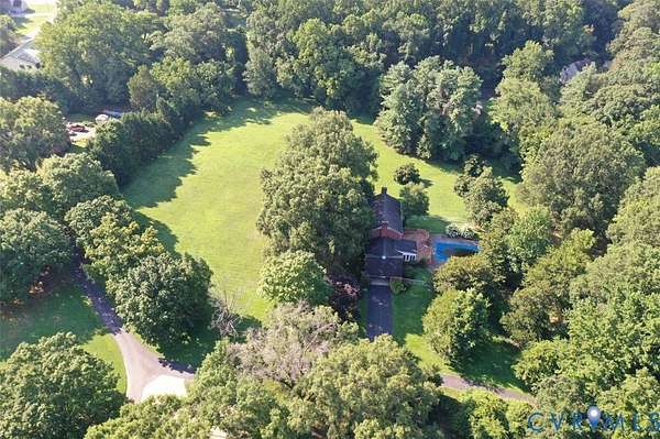 PARK-LIKE SETTING. Built in 1968, this Colonial Revival home is a dignified presence set well back from the street and enveloped in luxuriant, green privacy. A cherished home for 33 years, the four-bedroom, 3.5 bath brick house on 3.510 acres is for sale with an adjacent 0.321 parcel presenting a development possibility. A contemporary riff on traditional design, the house is nicely detailed with hardwood floors, classic trim, exposed beams, wood-burning fireplaces, and large windows overlooking a sweeping lawn and 800 SF. swimming pool. From the front door you step into a gracious entrance hall with a staircase. To the left is a large living room with a fireplace and picture windows on either end. To the right of the hall is a dining room with a large window overlooking the front lawn. Adjacent to the dining room is a cozy family room with fireplace and exposed antique beams, a door to the two-car garage and French doors to a Florida room overlooking the pool and deck with retractable sunshade. A spacious and open kitchen designed for entertaining has a butler's pantry, island with seating, adjacent powder room, and access to the rear deck and pool. Upstairs are four bedrooms, including a Primary with en suite bath and generous closets. Bring your dreams to the full basement with interior and exterior access. With a large, paneled Rec room complete with fireplace, built-ins and windows, it could be combined with an existing full bath and unfinished storage area into a self-contained living suite or the storage room could be finished as an office, studio or home theatre. This rural retreat is only minutes from shopping, restaurants, and the Richmond VA Medical Center.