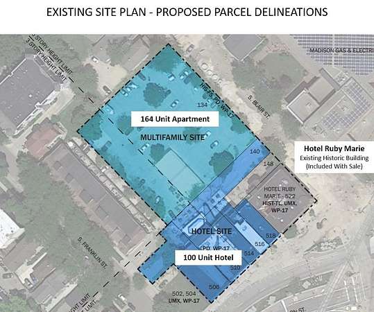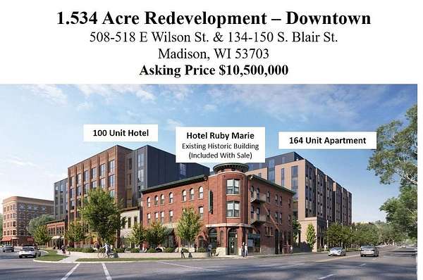 Prime 1.534 Acre Redevelopment opportunity in downtown Madison, WI! It is currently the Come Back In, Essen Haus Restaurant and Ruby Marie Hotel located at 508-518 E Wilson St. & 134-150 S. Blair St., this property offers magnificent views of Lake Monona. This versatile lot has city approval for a 164-unit apartment building, a 100-room hotel and comes with an existing historic building - Hotel Ruby Marie but the canvas can be yours to paint, tailor this site to your vision whether it's a grand residential project or a mix of luxury apartments and hotel accommodations. The potential for this 1.534-acre gem knows no bounds. Don't miss this rare chance to shape the skyline of downtown Madison. Take the reins of this exciting real estate offering where endless opportunities await.