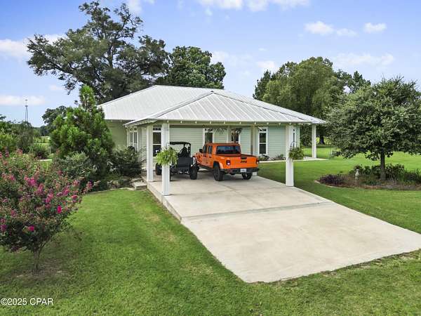 Custom-designed and built Country Estate on 12 acres. This newer home built in 2020, features 2000 sq ft of living space (2920 sq ft under roof), with expansive porches and a detached 2-car carport. There is a sitting platform (ready for a hot tub or fire pit), with electric and water, that is beautifully landscaped to enjoy year-round serenity. The home is built to the new hurricane standards with 2x6, 10 ft. walls, 6 ft windows throughout with transoms, low-e tempered glass, Hardi board siding, metal wind-resistant hip roof, and energy-efficient spray foam insulation. Other interior features are 8 ft interior doors, luxury vinyl plank flooring, and a spacious open floor plan. The current Den could easily be converted to a third bedroom. The fully landscaped yard has an in-ground irrigation system in the front yard and behind the house. The porches have new, concrete skid-resistant custom color paint flake coating epoxy finishes applied by Deese Elite Custom within the last 6 months. There is a garden location that has well established Navajo thornless blackberries and peach trees. There are water lines running to numerous locations at the barn/shop and into the pasture area. Conveniently situated to the home is an expansive red steel building with a 400 sq ft. apartment or office and a 20x30 enclosed shop with double roll-up pass-through doors and concrete flooring. The office has a full kitchen, bathroom with shower, a fold down queen size murphy bed with side cabinet storage, and an inviting covered front porch to enjoy the full view sunsets. The property's premium location is just minutes (via paved road access) to Marianna Florida, or about 25 minutes to Dothan, Alabama, or about an hour away to Panama City. The county estate is suitable for horses and other livestock. The land is zoned one home per acre and has no deed restrictions. There is an additional 14 acres available.
