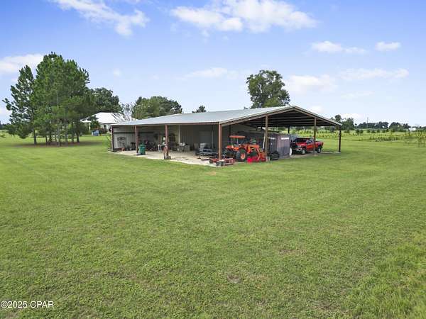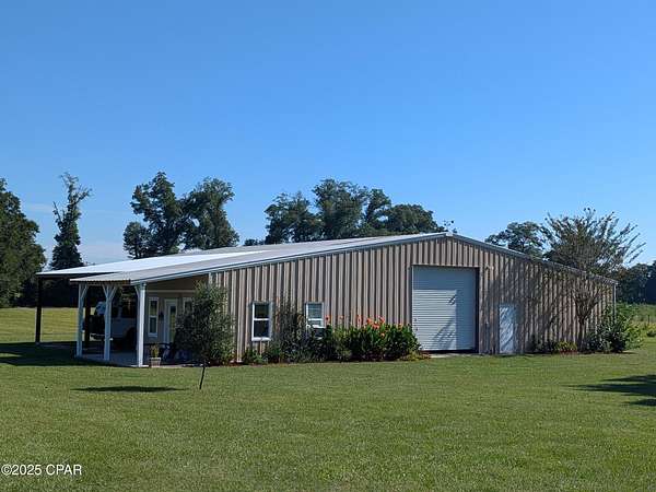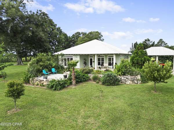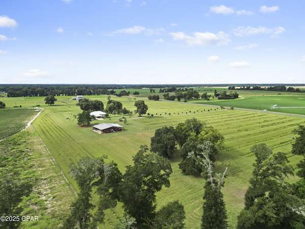 Custom-designed and built Country Estate on 26 acres. This newer home built in 2020, features 2000 sq ft of living space (2920 sq ft under roof), with expansive porches and a detached 2-car carport. There is a sitting platform (ready for a hot tub or fire pit), with electric and water, that is beautifully landscaped to enjoy year-round serenity. The land is planted with Loblolly pine trees double rows 45-50 ft apart, to allow for grazing or hay production with an income potential in the future while enjoying additional privacy. There is a large open flat area to the north of the barn for an arena. The home is built to the new hurricane standards with 2x6, 10 ft. walls, 6 ft windows throughout with transoms, low-e tempered glass, Hardi board siding, metal wind-resistant hip roof, and energy-efficient spray foam insulation. Other interior features are 8 ft interior doors, luxury vinyl plank flooring, and a spacious open floor plan. The current Den could easily be converted to a third bedroom. The fully landscaped yard has an in-ground irrigation system in the front yard and behind the house. The porches have new, concrete skid-resistant custom color paint flake coating epoxy finishes applied by Deese Elite Custom within the last 6 months. There is a garden location that has well established Navajo thornless blackberries and peach trees. There are water lines running to numerous locations at the barn/shop and into the pasture area. Conveniently situated to the home is an expansive red steel building with a 400 sq ft. apartment or office and a 20x30 enclosed shop with double roll-up pass-through doors and concrete flooring. The office has a full kitchen, bathroom with shower, a fold down queen size murphy bed with side cabinet storage, and an inviting covered front porch to enjoy the full view sunsets. The property's premium location is just minutes (via paved road access) to Marianna Florida, or about 25 minutes to Dothan, Alabama, or about an hour away to Panama City. The county estate is suitable for horses and other livestock. The land is zoned one home per acre and has no deed restrictions. With approx. 1240 Highway 71 road frontage, and a county-approved named road, Palamino Lane. This property is easily subdivided if desired in the future.