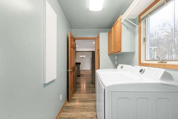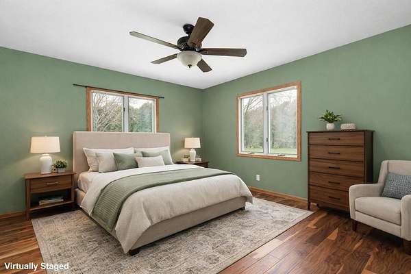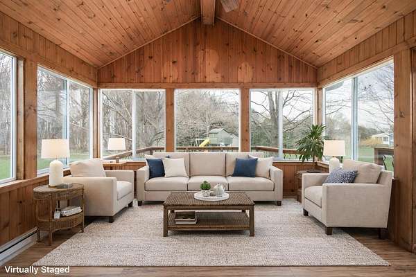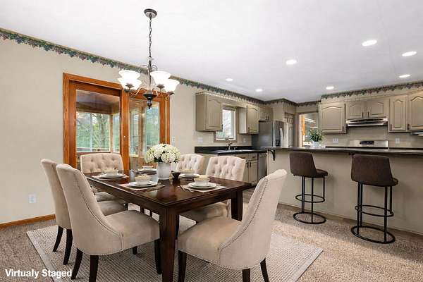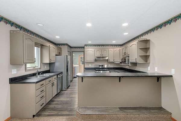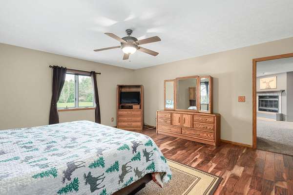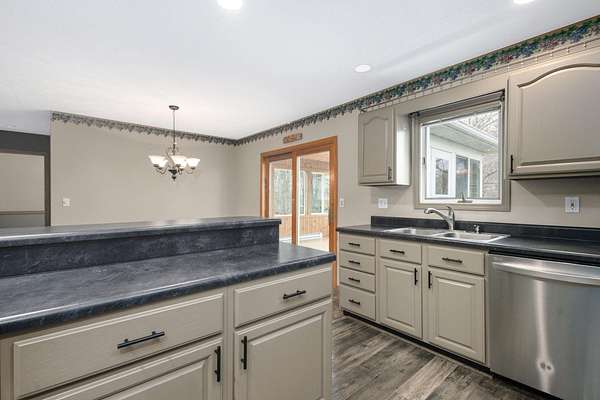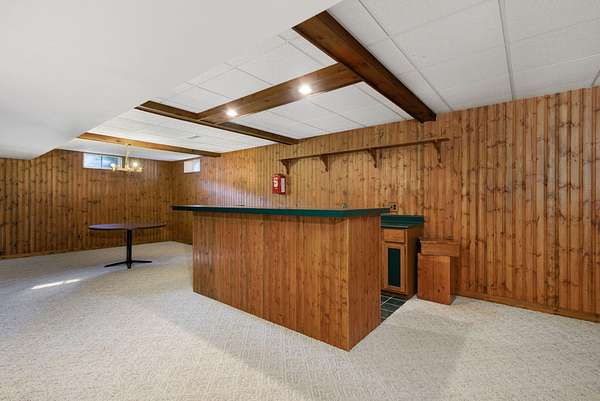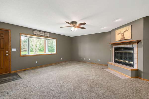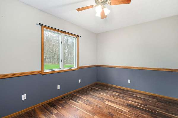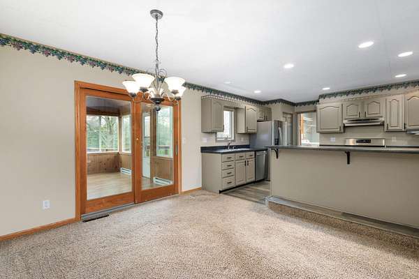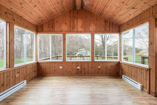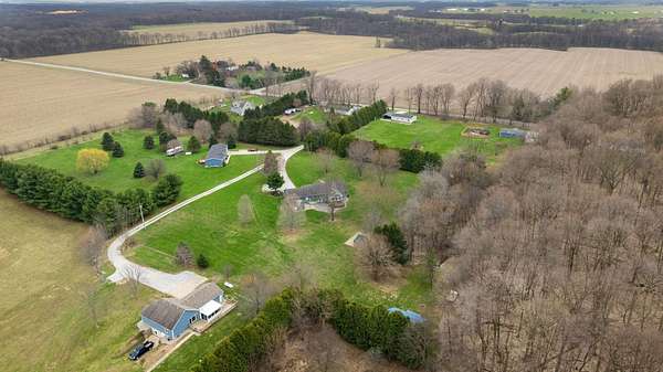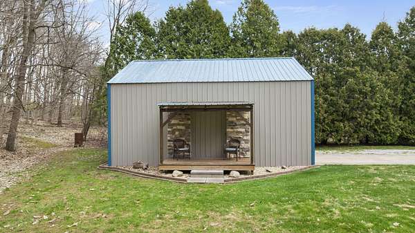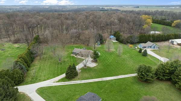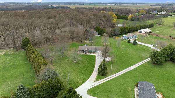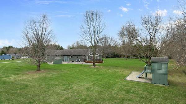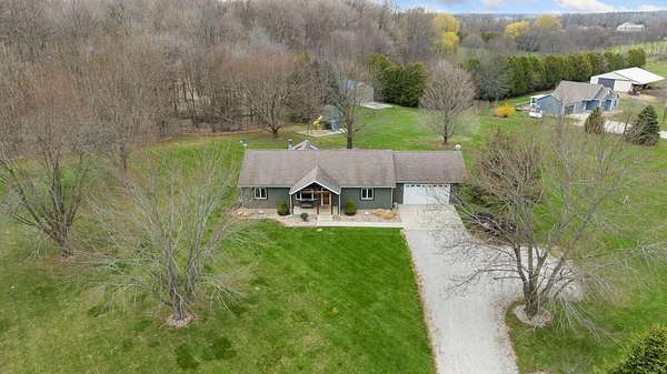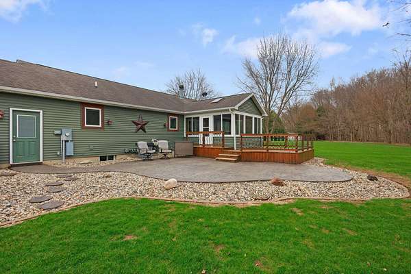 Nearly 3 acres in the desirable New Prairie school district with a 24x30 outbuilding and stunning all-seasons room! Be welcomed by a charming covered front porch as you enter this well maintained 3 bedroom, 3 bath ranch offering a functional layout with a finished daylight basement. The open living room features a wood burning fireplace and bay window that looks out over the covered front porch with a beautiful view of the pine tree-lined front yard, and flows into the dining and kitchen area. The kitchen offers solid oak cabinetry, counter top seating, and stainless steel appliances. From the dining room, a sliding glass door leads to the all-seasons room with wall-to-wall windows and skylights, offering beautiful views of the backyard and creating a bright, inviting space to relax and enjoy year-round. The primary suite includes hardwood flooring, a walk-in closet, and a 3/4 bath, while two additional bedrooms and a full bath are located on the opposite side of the home. Main floor laundry adds convenience. The finished daylight basement features a spacious family room with wet bar and pool table area, an additional room ideal for an office, gym, or flex space, a large storage/utility room with convenient shelving, and a 3/4 bath with shower ready for finishing touches. Outdoor living is just as impressive, with meticulous landscaping, a deck off the all-seasons room that steps down to a beautifully stamped concrete patio, and a well-positioned playset. The 24x30 outbuilding is equipped with concrete flooring, electric, a 12x11 overhead door, and a side entry with covered porch--ideal for storage or workshop. Attached 2.5 car garage with rear access door. All appliances included. Property is being sold As-Is. A rare opportunity to enjoy space, privacy, and comfort in a desirable area.