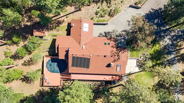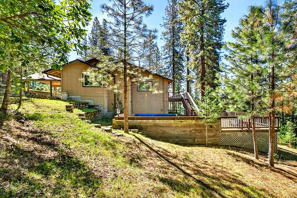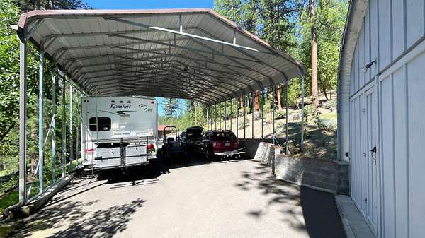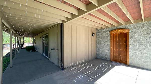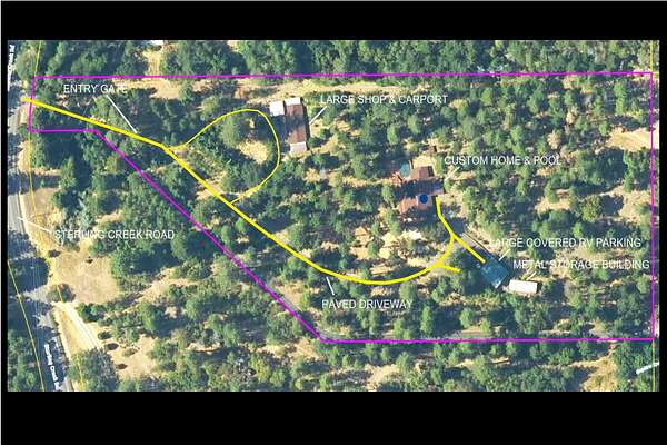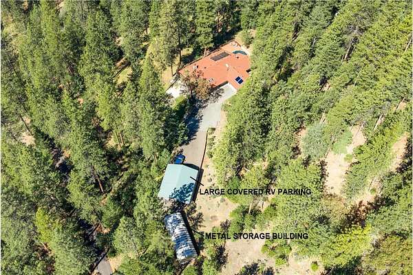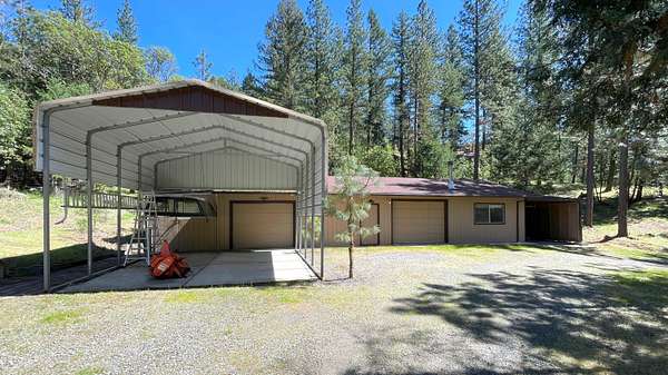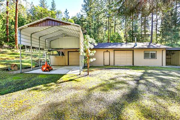 Private rural retreat on 6.26 scenic acres. Provides privacy with convenient access to Historic Jacksonville, Medford Inter. Airport, shopping/dining/medical, well-known wineries & recreation areas. This unique property has it all: well-maintained 3,117 sq ft, 3 bed/3 bath home w/expansive deck & patio spaces with elevated view of park-like setting, gated entry, paved driveway, impressive outbuildings including a 25'x72' shop w/full bathroom, 16'x40' metal storage building/shop, multiple carports, large 30'x36'x16' covered RV parking area w/full hook-ups, + 18,000-gallon pool. Home has main level living featuring vaulted great room, built-in cabinets, cozy wood fireplace, open kitchen, spacious dining area w/covered patio access, updated guest bath, utility room, & primary suite w/deck access. Day-light basement includes 2 large bonus rooms, full bath w/walk-out access to the yard, patio, wine cellar, & fenced pool/sun deck. Truly a peaceful, resort-like setting just minutes from town.