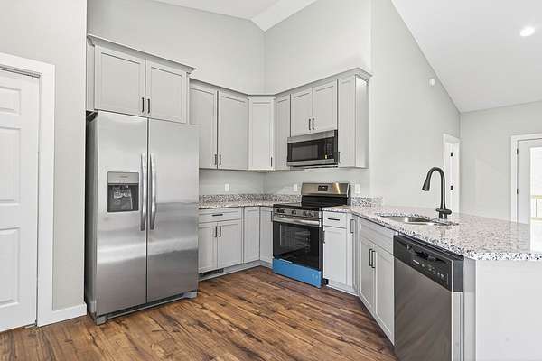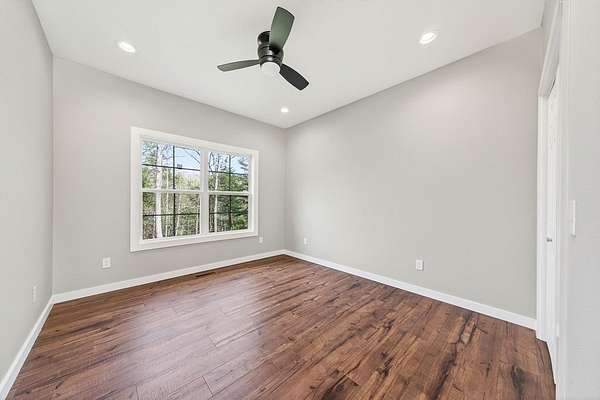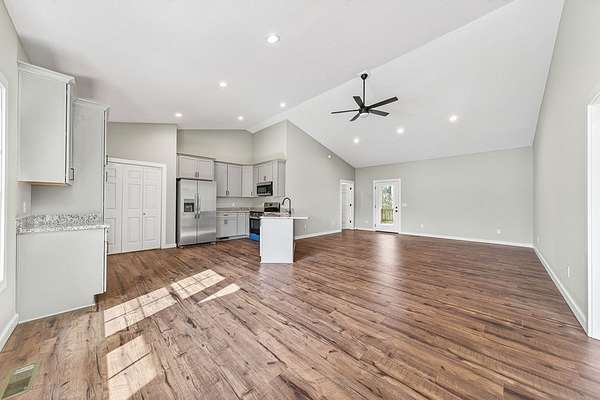 Brand new construction with 1,380 sq ft of living space plus 400sf finished 2-car attached garage Located at the end of a cul-de-sac in a small neighborhood with great privacy Offered at $349,000 with 4.62 acres or $319,000 with 1.81 acres Additional 2.81 acre lot is cleared and approved for a 3-bedroom septic system 3 bedrooms, 2 full baths Open living, kitchen, and dining area with vaulted ceiling Split bedroom floor plan for added privacy 9' ceilings in bedrooms and baths Shaw 12mm water-resistant laminate flooring in living areas Tile flooring in bathrooms Kitchen features granite countertops, 42" wall cabinets, pantry cabinet, soft-close doors and drawers Stainless appliances include smooth-top range, microwave, dishwasher, and refrigerator Spacious primary suite with quartz double vanity, tub/shower combo, transom window, walk-in closet, and 12x24 tile Guest bedrooms have closets and ceiling fans