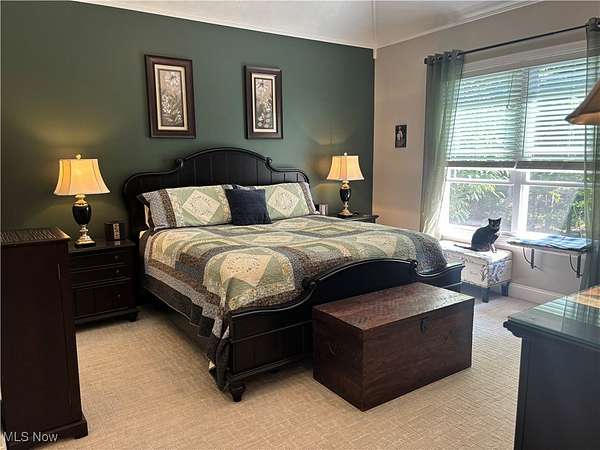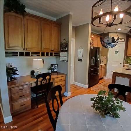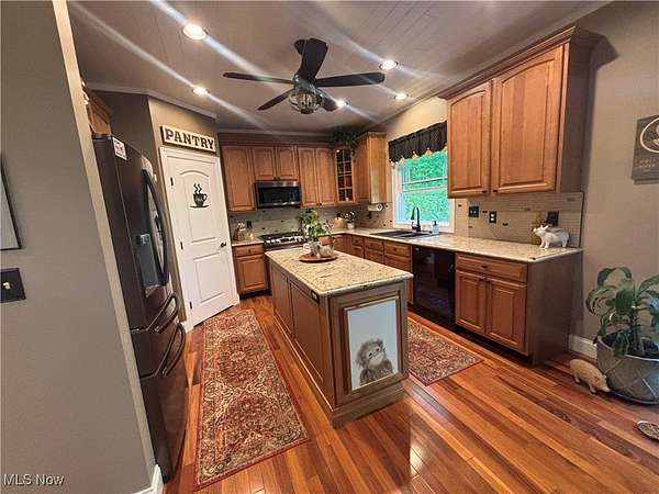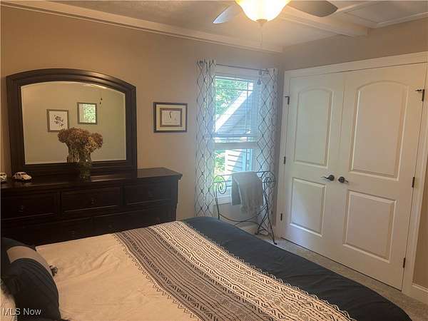 - Beamed Ceilings, Ceiling Fans, Crown Molding, Eat In Kitchen, Entrance Foyer, Granite Counters, High Ceilings, Kitchen Island, Open Floorplan, Pantry, Primary Downstairs, Recessed Lighting, Walk In Closets