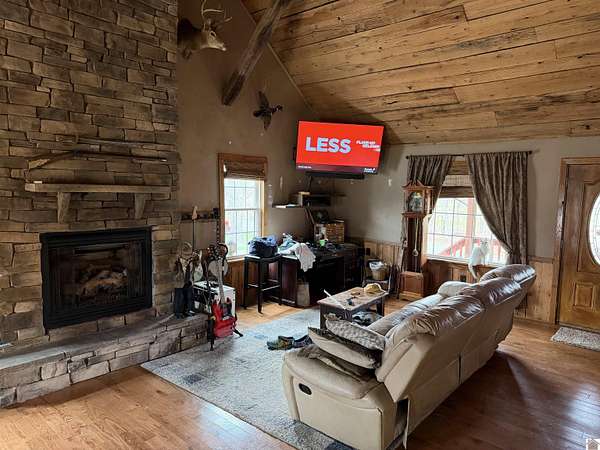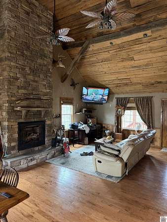 Welcome home to the country! This 2 bedroom, 2 bath home features volume ceilings and an open floor plan, beautiful high ceiling fireplace has ventless gas logs, hardwood floors, kitchen with gas stove and ceramic tiled floor. The Primary bedroom is on the main level. The Primary bath features a Jacuzzi tub and walk-in shower. There is a Tankless water heater, too. You'll have plenty of room to roam on the 9.53 acres. Property is in a flood plain. This is a peaceful place with a nice country setting and no close neighbors. You can almost hear yourself breathe.