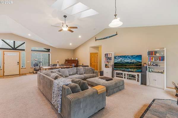 - Ceiling Fan, High Ceilings, Laminate Flooring, Laundry, Skylight, Vaulted Ceiling, Wallto Wall Carpet, Washer Dryer