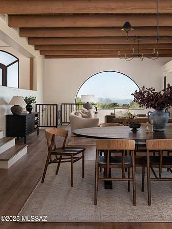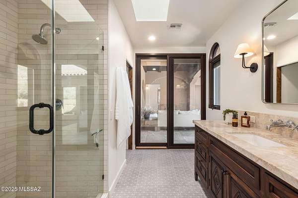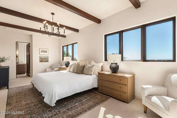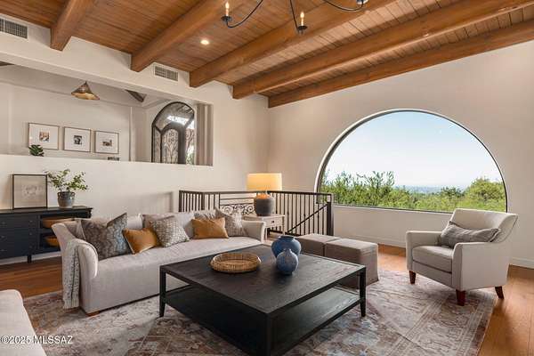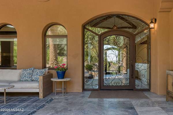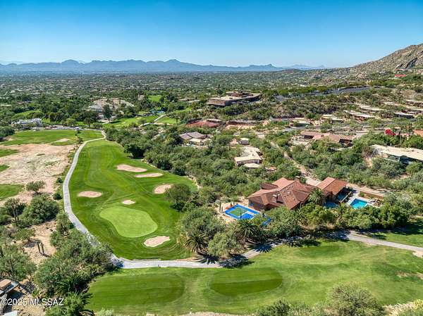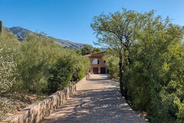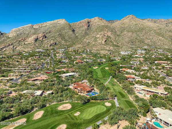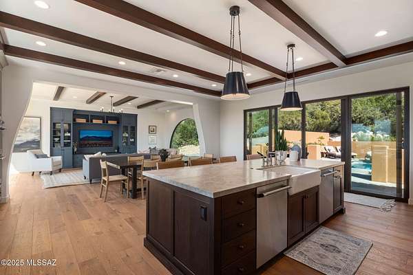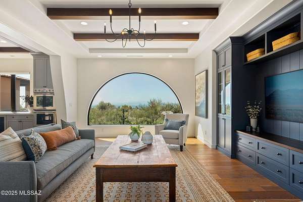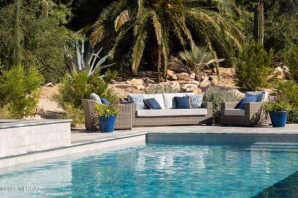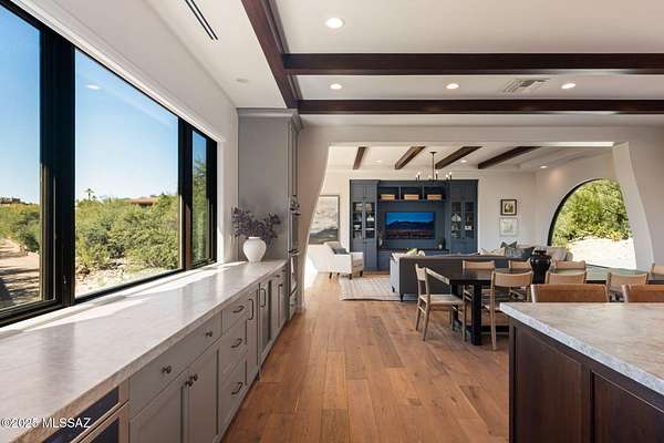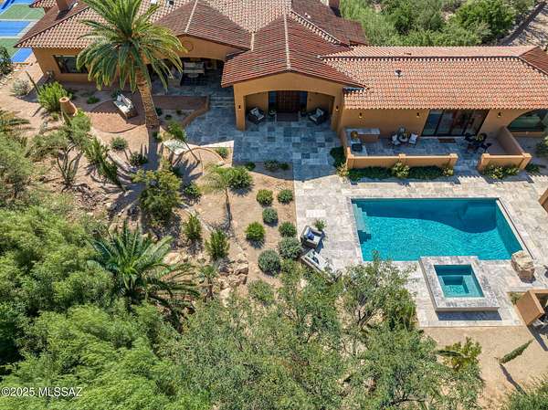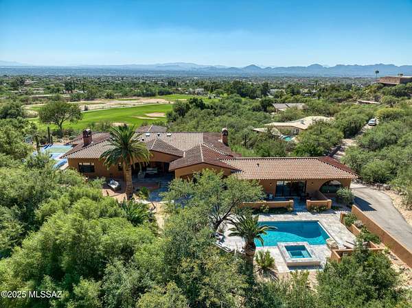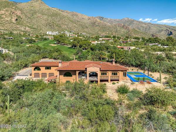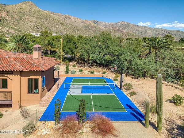 Unique Santa Barbara Style home fully re-built in 2024 with attention to detail. It features a flexible floorplan with space for many options. The recent addition includes a homey but beautiful family room, gourmet kitchen, bespoke powder room with an amazing scullery/pantry area that all makes a perfect gathering place. The oversized hallway has built in desks and shelving which is as attractive as it is functional. The living dining room features high beamed ceilings that draw the eye to a picture window and magical city lights with views to downtown-which are also featured on the back deck. There are 3 bedroom suites each uniquely designed and laid out on the main level. Downstairs is a flex room that could be easily accessed as a home office with an additional bedroom and full bath Newly added...a pickleball court which will provide a hub for entertaining and keeping fit! Bring friends and family to play in the beautiful Tucson desert with the pool, pickleball, basketball, outdoor barbecue includes a pizza oven, neighborhood country club, tennis courts, restaurant, work out facility and golf course. The exterior has an abundance of niche spaces for enjoying the beautiful setting but none more dramatic than the pool with its majestic mountain views. So close to shopping, restaurants and activities. Inside and out this classy up-dated property is unique in any location but especially rare in Tucson.
