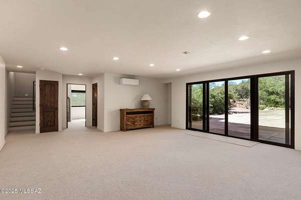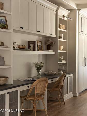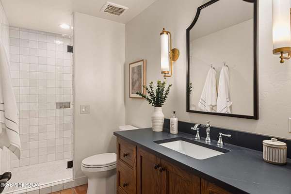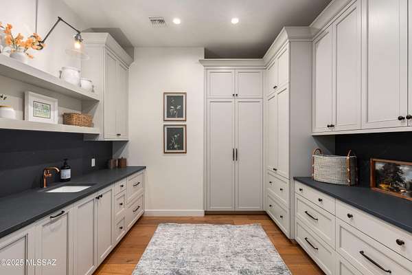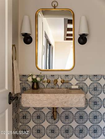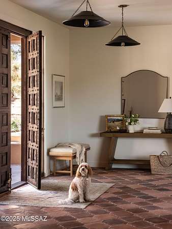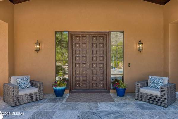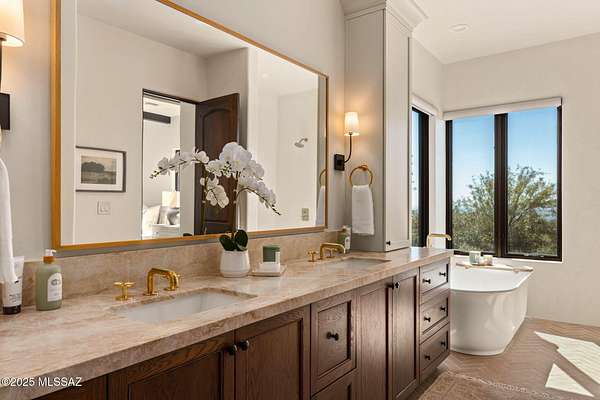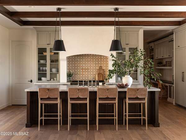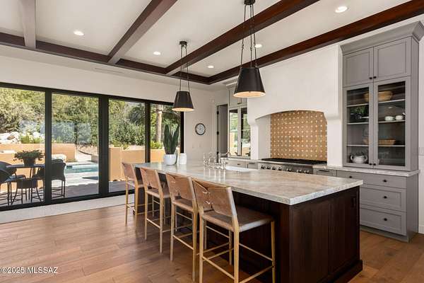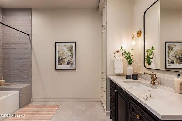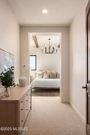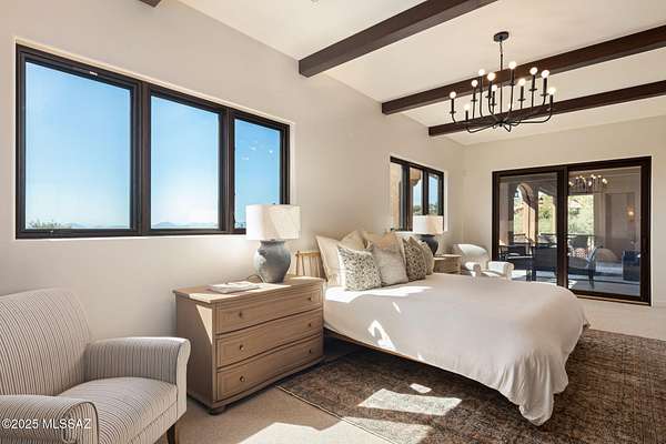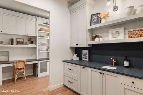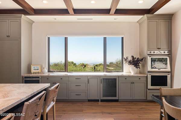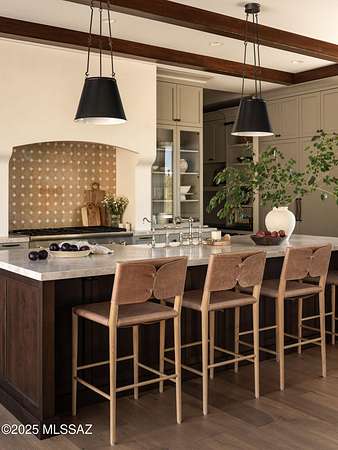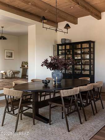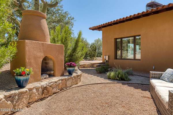 Unique Santa Barbara Style home fully re-built in 2024 with attention to detail. It features a flexible floorplan with space for many options. The recent addition includes a homey but beautiful family room, gourmet kitchen, bespoke powder room with an amazing scullery/pantry area that all makes a perfect gathering place. The oversized hallway has built in desks and shelving which is as attractive as it is functional. The living dining room features high beamed ceilings that draw the eye to a picture window and magical city lights with views to downtown-which are also featured on the back deck. There are 3 bedroom suites each uniquely designed and laid out on the main level. Downstairs is a flex room that could be easily accessed as a home office with an additional bedroom and full bath Newly added...a pickleball court which will provide a hub for entertaining and keeping fit! Bring friends and family to play in the beautiful Tucson desert with the pool, pickleball, basketball, outdoor barbecue includes a pizza oven, neighborhood country club, tennis courts, restaurant, work out facility and golf course. The exterior has an abundance of niche spaces for enjoying the beautiful setting but none more dramatic than the pool with its majestic mountain views. So close to shopping, restaurants and activities. Inside and out this classy up-dated property is unique in any location but especially rare in Tucson.