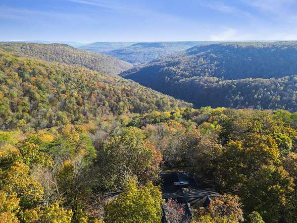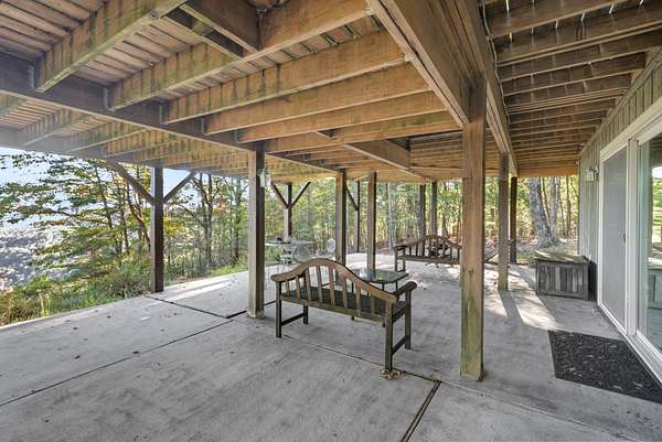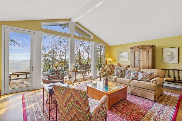 Sited on 5 private acres with a formal courtyard approach, the home is enveloped by hardwood forest and miles of community walking trails. Clifftops amenities include a stocked lake with dock for fishing, kayak or paddleboard, and a bluff-top clubhouse -- mere steps away -- with pool, tennis, and pickleball courts. Don't miss this opportunity to buy a fantastic mountain retreat with the best view on the mountain in the desirable Clifftops neighborhood.