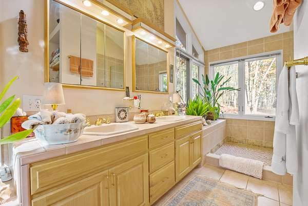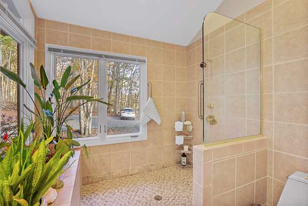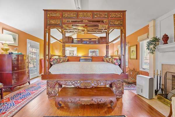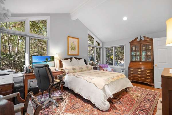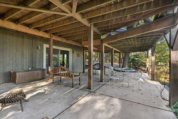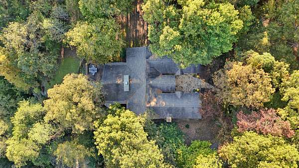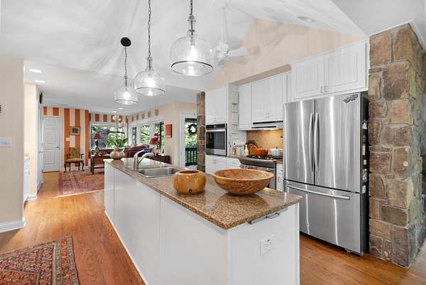 The front entry opens to a wall of glass framing the view, an expansive open plan with a grand dining room, showpiece kitchen with new countertops, lighting and an envy-worthy pantry, and a stone-clad living room anchored by a fireplace and the bluff beyond. Hardwood floors run throughout. The primary suite offers a second fireplace and a spa-style bath with separate tub and shower. The guest suite enjoys its own full bath, a dedicated office and library with wet bar, and access to a screened porch. Every side of the home is ringed with porches to drink in the light, wind and woods.