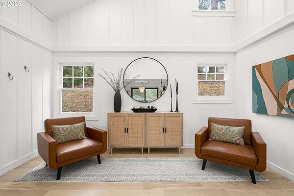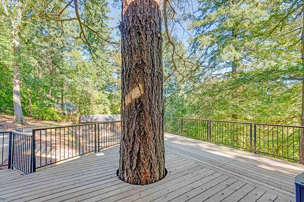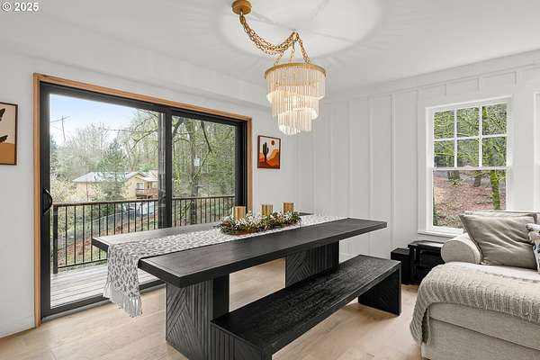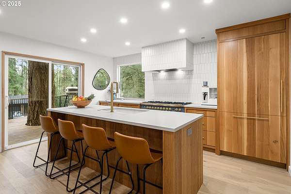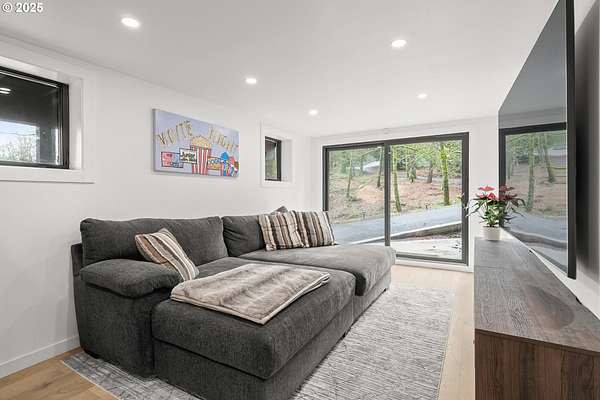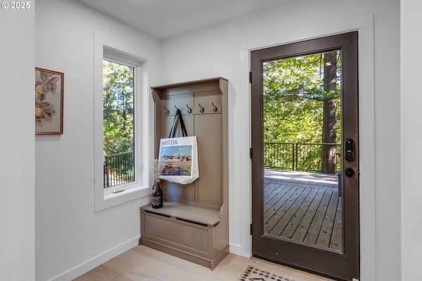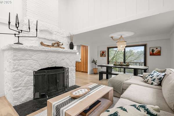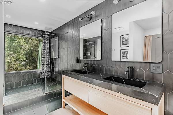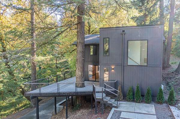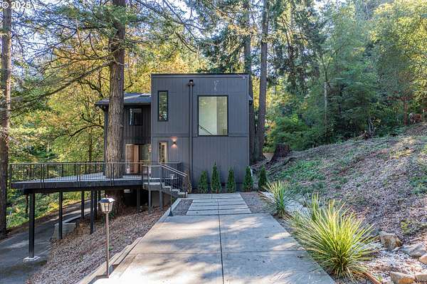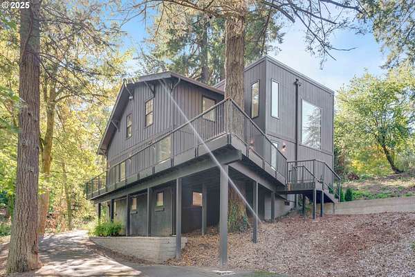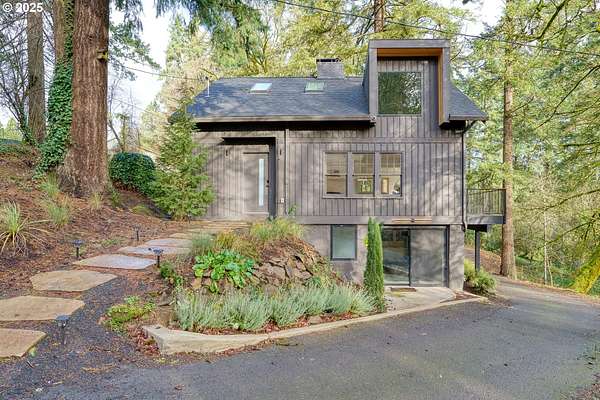 Nestled among the trees on over 1.5 acres in Portland, this striking modern three-story home offers a perfect balance of natural serenity and sophisticated design. The exterior's dark, moody tones contrast beautifully with the light and airy interior, where soaring vaulted ceilings, skylights, and expansive windows fill the space with natural light. The living room features a stunning stone fireplace as its centerpiece, while the dining area seamlessly connects to a chef's kitchen with custom cabinetry, an island, built-in refrigerator, and sliding doors that open to a spacious deck for effortless indoor-outdoor living. A stylish half bath and a flexible main-level room-ideal as an office or sitting area-add to the home's functionality. Upstairs, the luxurious primary suite impresses with vaulted ceilings, a skylight, a walk-in closet, and a spa-like ensuite bath featuring a double vanity and an oversized walk-in shower with dual shower heads. A second upstairs bedroom also includes its own ensuite bath, offering privacy and comfort. The lower level is designed for both relaxation and entertainment, with a temperature-controlled wine cellar, a bedroom, a full bath with a walk-in glass shower, a laundry room, and a spacious bonus room complete with a wet bar-perfect for gatherings. Outside, a detached two-car garage includes a dedicated gym area, completing this exceptional property. Designed with meticulous attention to detail and surrounded by the beauty of the Pacific Northwest, this residence offers a rare blend of modern luxury and tranquil seclusion.