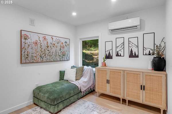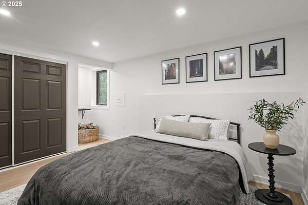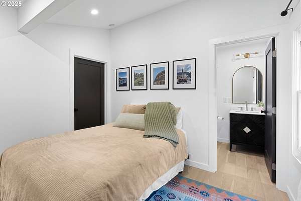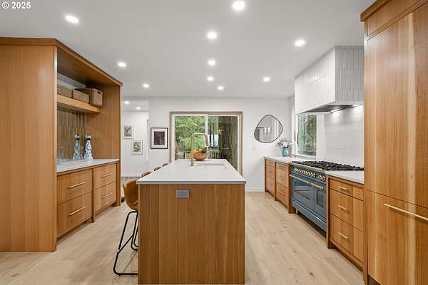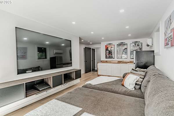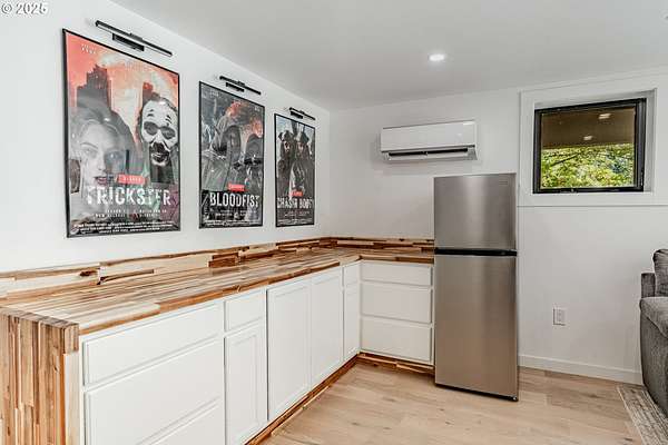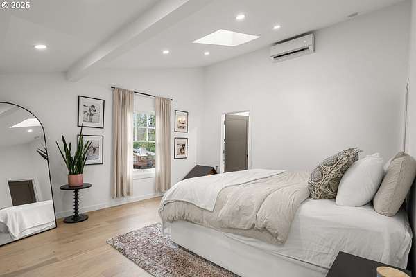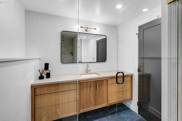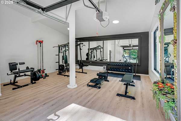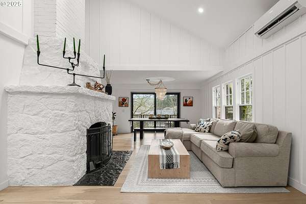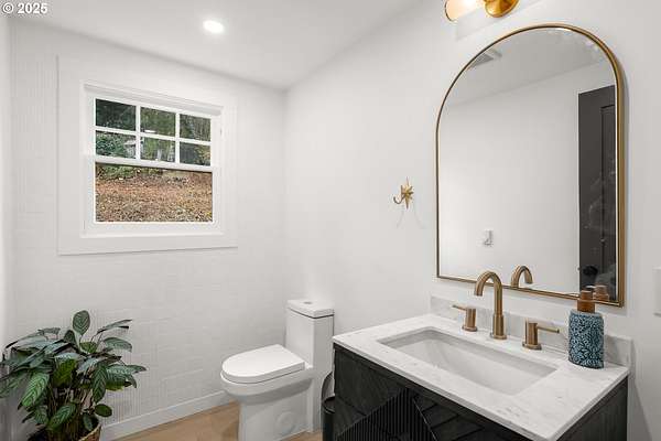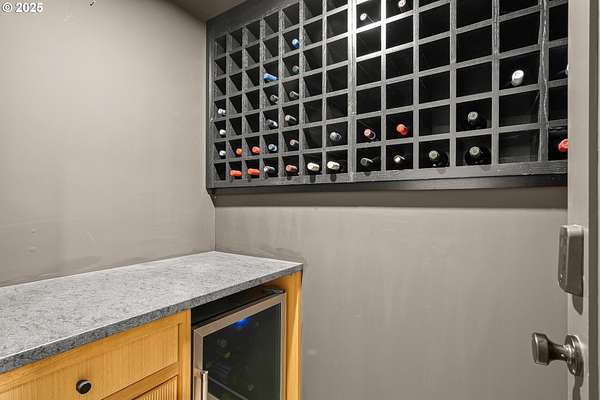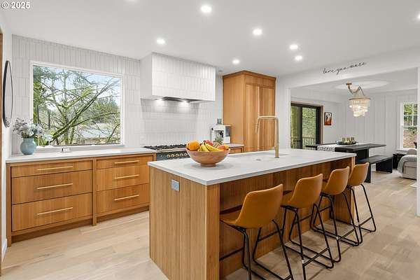 Nestled among the trees on over 1.5 acres in Portland, this striking modern three-story home offers a perfect balance of natural serenity and sophisticated design. The exterior's dark, moody tones contrast beautifully with the light and airy interior, where soaring vaulted ceilings, skylights, and expansive windows fill the space with natural light. The living room features a stunning stone fireplace as its centerpiece, while the dining area seamlessly connects to a chef's kitchen with custom cabinetry, an island, built-in refrigerator, and sliding doors that open to a spacious deck for effortless indoor-outdoor living. A stylish half bath and a flexible main-level room-ideal as an office or sitting area-add to the home's functionality. Upstairs, the luxurious primary suite impresses with vaulted ceilings, a skylight, a walk-in closet, and a spa-like ensuite bath featuring a double vanity and an oversized walk-in shower with dual shower heads. A second upstairs bedroom also includes its own ensuite bath, offering privacy and comfort. The lower level is designed for both relaxation and entertainment, with a temperature-controlled wine cellar, a bedroom, a full bath with a walk-in glass shower, a laundry room, and a spacious bonus room complete with a wet bar-perfect for gatherings. Outside, a detached two-car garage includes a dedicated gym area, completing this exceptional property. Designed with meticulous attention to detail and surrounded by the beauty of the Pacific Northwest, this residence offers a rare blend of modern luxury and tranquil seclusion.