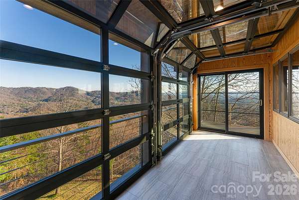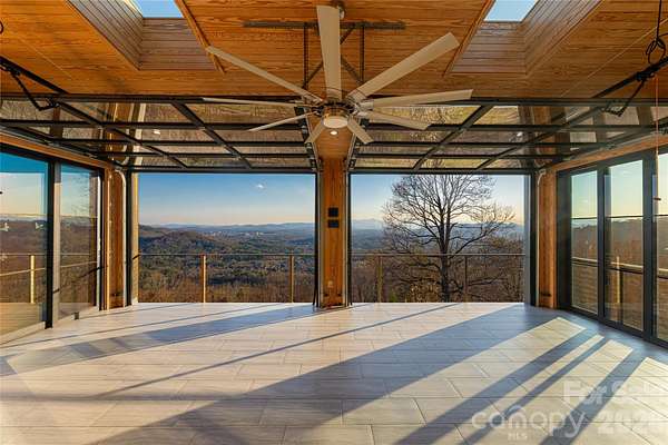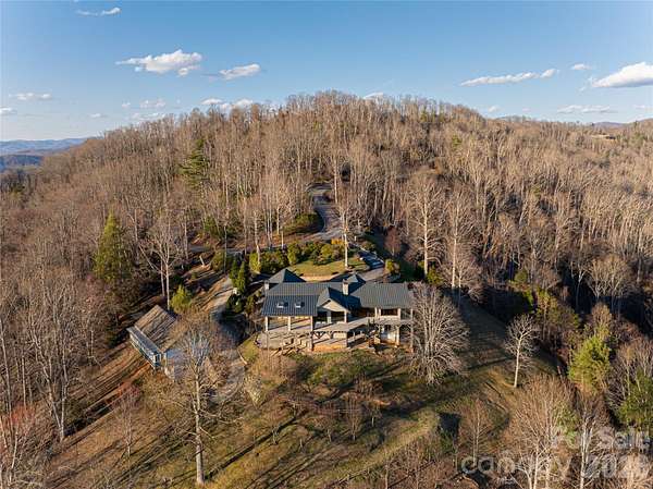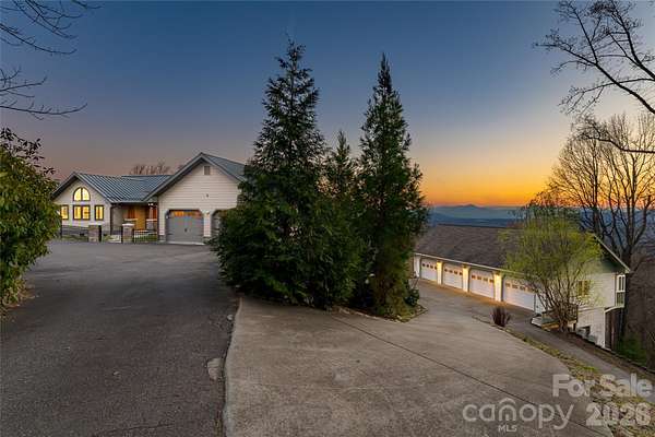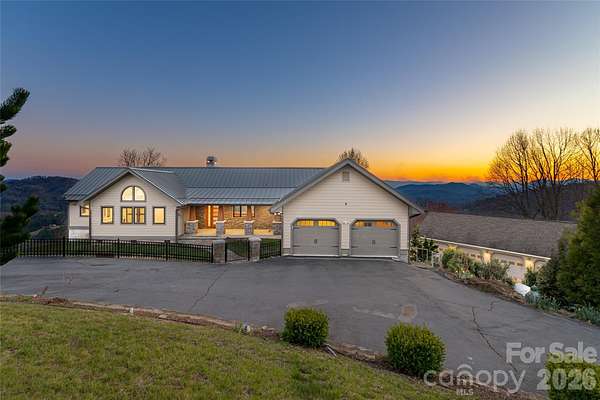 Perched on a generously sunny high plateau over 7.11 private acres, this architectural gem offers stunning panoramic views of Asheville, the iconic Blue Ridge Mountains, and Mount Pisgah behind Biltmore. A unique opportunity to be ten minutes from fine dining and shopping, and also cycle to The Blue Ridge Parkway. The immense beauty of traveling north of town up Elk Mountain, designated in the 1930s as 'NC Scenic', remains remarkable. This custom-designed home is tucked behind a private gated circular driveway and has been lovingly updated over the decades. The epitome of refined mountain living embraces the seasons as operable walls throughout the home blur the lines between indoor and outdoor spaces. Experience dawn over Tanbark Ridge & Town Mountain to the east as you sip coffee from your bedroom suite with red-tailed hawks flying below. As the day progresses, find yourself having dinner & cocktails at the other end of the home as you become one with the sunset, just before Asheville's twinkling lights perform. This legacy estate is more than a residence; it is a retreat. Custom-designed for entertaining, the great room and massive stone fireplace spill into a breathtaking open-designed, extraordinary chef's kitchen. The personal resting wing of the home is a beautiful combination of a wormy chestnut library and modern luxurious sensibilities; extraordinary bathing rooms and large closets. The downstairs family/guest quarters offer privacy, big views, and outdoor access. Walk among fruit trees to a detached greenhouse and expansive 6-car garage, which could be transformed into a creative studio space or workshop.