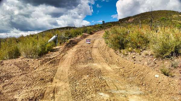 Drive to the end of Quail Trail -Go immediately northwest across little stream -After about 50 yards, take the first right -You will now be on the freshly graded road. Stay -on that fresh road as it goes northeast and then north, about 400 yards. Go between these two trees -After about 600 more yards, you will get to this locked chain -Stay on this fresh road as is continues up to the cabin