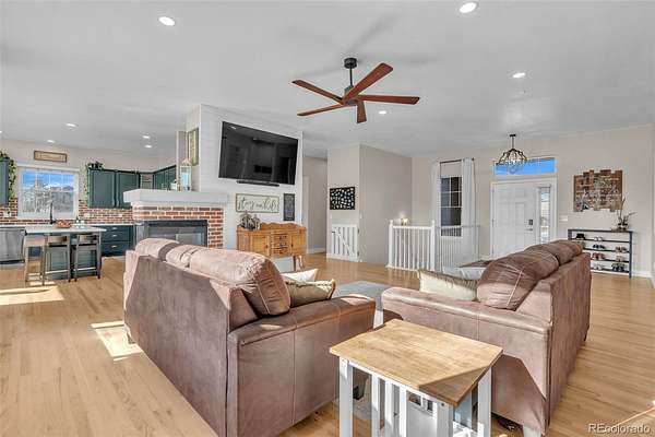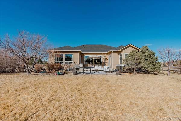 Gorgeous rancher on 1.5 ACRES in the golf community of Spring Valley Ranch! Welcome home to a large home with stunning updates and room to roam on one of the largest corner lots in the area, plenty of room to build that dream outbuilding if you are looking for more than 3 car attached storage. No dirt roads here, paved county roads and private driveway. Step inside to a terrific floor plan with gorgeous solid refinished oak hardwood floors, tons of natural light from dramatic windows, newer paint and carpeting and a dual sided fireplace. The gourmet custom kitchen is perfect for entertaining with lots of countertop and cupboard space and large breakfast nook (new quartz counters). The formal dining room can be anything even a main floor office, conveniently located off the kitchen but tucked in away from the activity of the house. The large primary suite and huge bathroom is cozy and quaint with wood grain real tile flooring and patio access. Two other bedrooms on the main level plus laundry room put everything you could need with no stairs. Full newly finished basement is the haven for privacy; tall ceilings, big rooms and home theatre concept for the family room is where you'll spend your evenings. You'll love the modern bathroom and basement finishes! There is nothing left to do in this one except move in; Newer Roof, Newer Furnace, Newer Paint, New 75 Gallon Hot Water Heater and so much more. Step outside for space and privacy, fenced back yard, mature landscaping and equipped for kiddos with a swing set and basketball court. This home is a great location just minutes from the country club and golf course, an easy drive from Parker or the town of Elizabeth. So much to love here, Seller must relocate so their loss is your gain. A real MUST SEE in a safe and quiet neighborhood where everyone enjoys the country living without being too far from modern amenities!