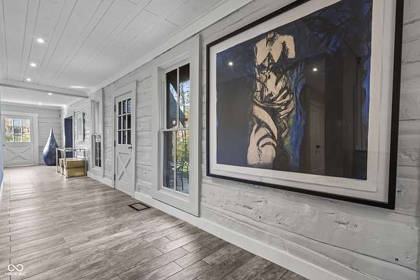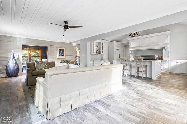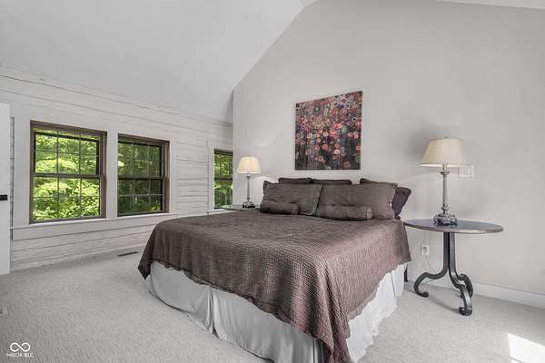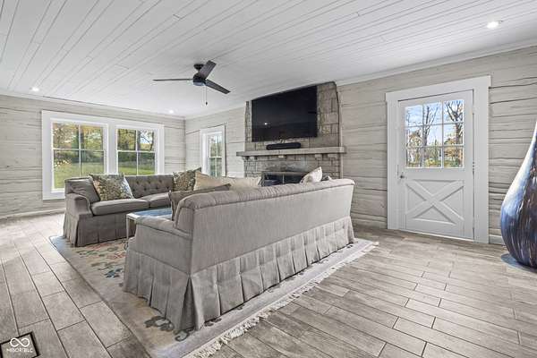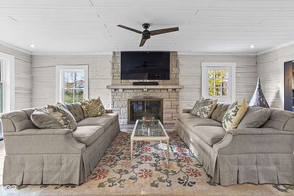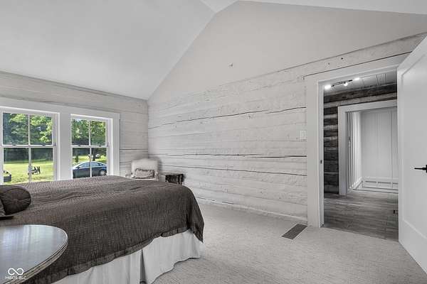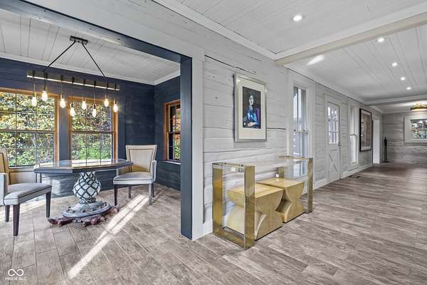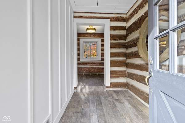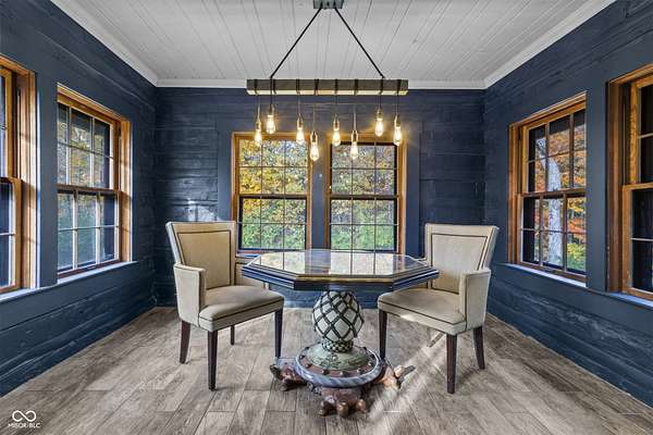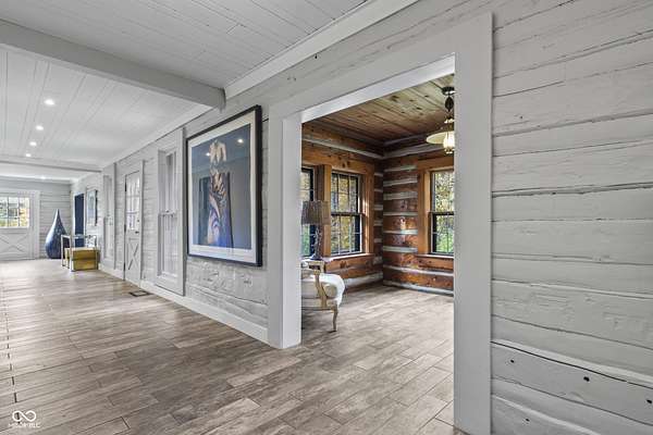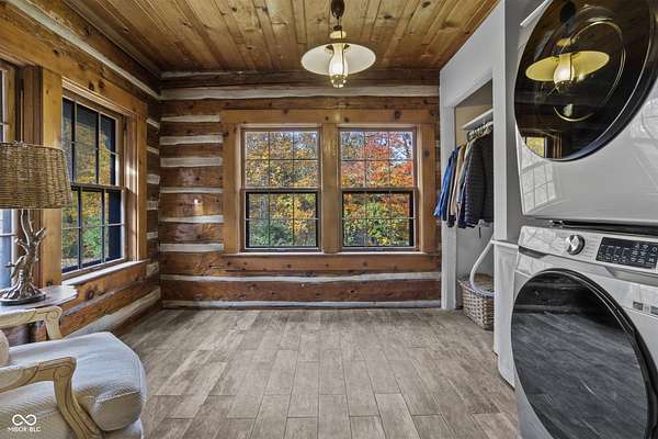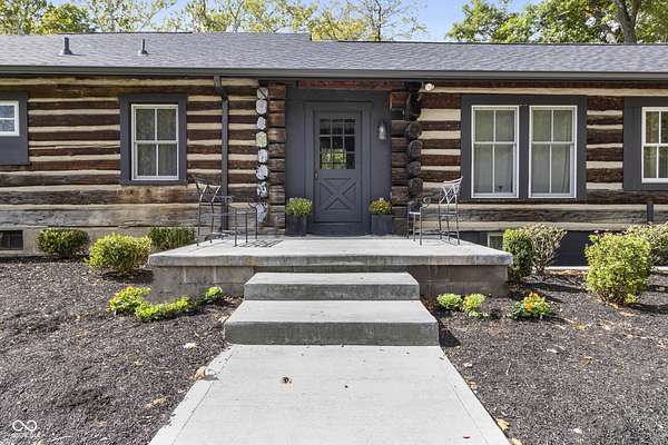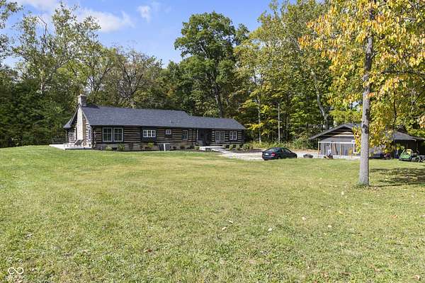 Experience a 7 acre private retreat in desirable Zionsville! The private drive "over the creek and through the woods" leads to this secluded and completely updated 4 bedroom, 3 full bath log cabin that has all of it's original charm but with modern and luxurious finishes. A true chef's kitchen features professional appliances and quartz counters, open to the great room boasting a floor to ceiling stone fireplace. The cozy dining room/den has incredible views, and well thought out master on the main with gorgeous ensuite. The finished basement has 2 bedrooms, full bath and huge family room with custom built-ins. Detached garage with additional flex space. Top rated Zionsville schools. Enjoy peaceful views and tranquility from every room - a must see!