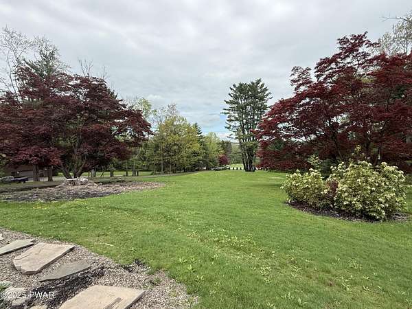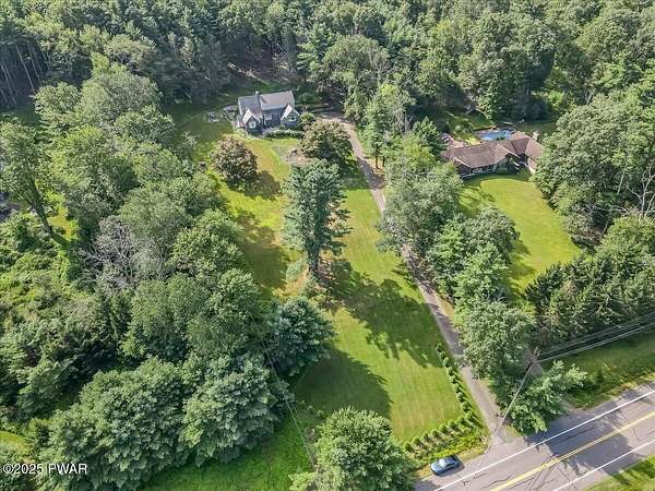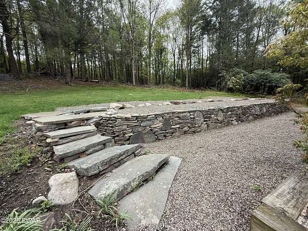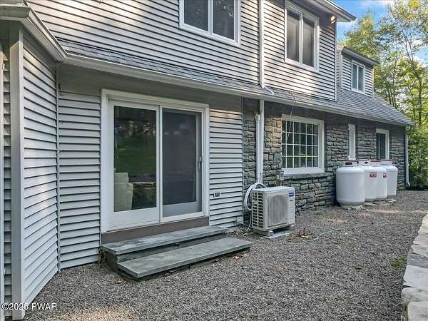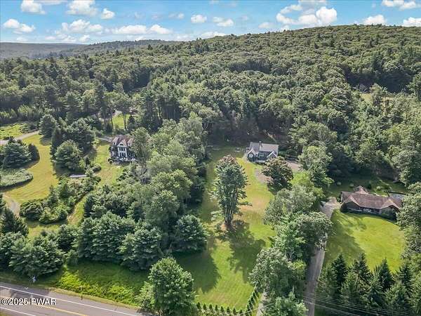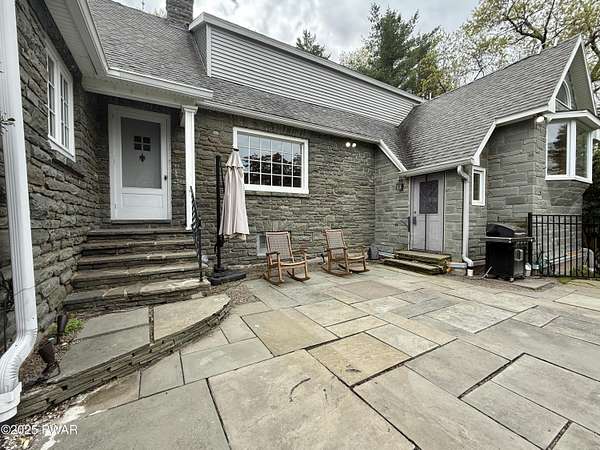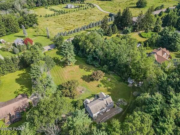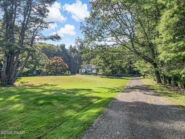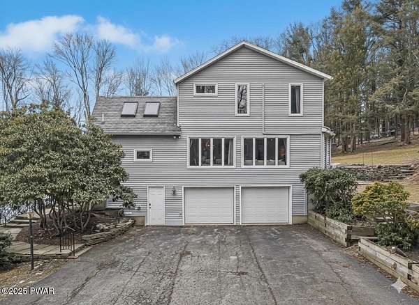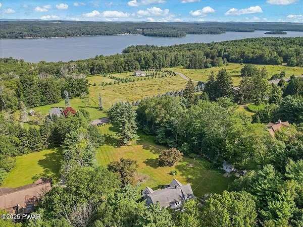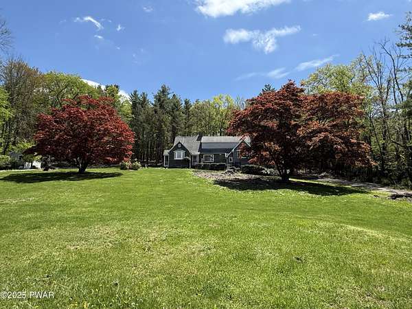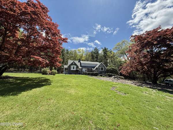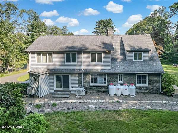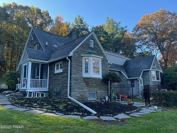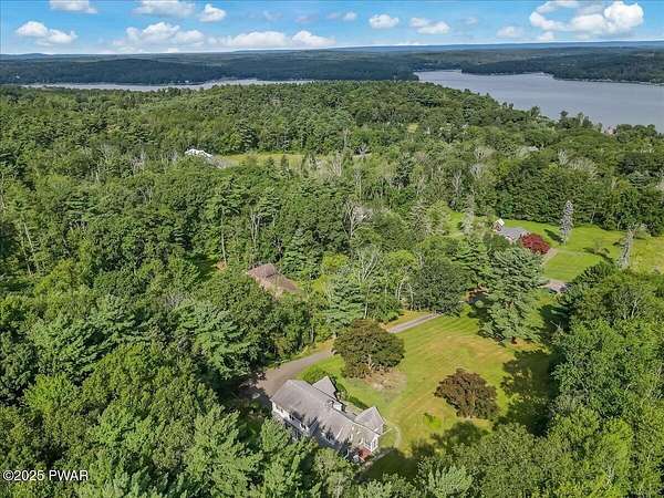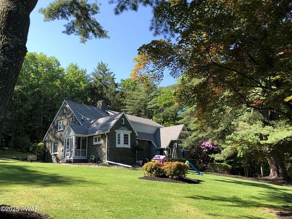 This amazing property offers it ALL - It sits outside of a community on 3.47 acres perched on top of the expansive front yard with seasonal views of Wallenpaupack! You will immediately admire the elegant, yet timeless bluestone stone exterior and long, private driveway.Imagine starting off your day cooking breakfast in your large kitchen with the view of your expansive private property. The kitchen and dining area feature beautiful tongue-and-groove ceilings, giving it that ''lake feel''. The dining area leads you through a county barn door to your bright living room, featuring an oversized stone fireplace with a remote-controlled propane insert that adds warmth and coziness to the living space. The original hardwood floors add even more character to this great space. You will appreciate the large windows throughout the home that fill every space with natural light. The expansive office features wooden built-in bookshelves, a 15-foot cathedral ceiling and a bay window, offering a perfect spot to relax or work in privacy! Also on the main level is a great playroom or dining room that can also be used as addition sleeping space. In between these two room is a full bathroom, complete with a tiled shower. On the second floor, you will find a primary bedroom with a spacious en-suite bathroom featuring a jacuzzi tub and a walk-in closet with wooden shelving. There should be no complaining of lack of storage space here! In addition to the walk-in closet, there are multiple cedar closets throughout the home. Just down the hall you will find 3 additional bedrooms and a beautiful third full bathroom with a tiles shower/tub combo.There are newly installed split units in each room ensuring you will be comfortable year-round. In addition, there is a stand-by Generac home generator, giving you ultimate peace of mind through every season.