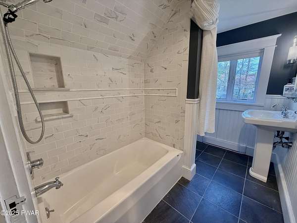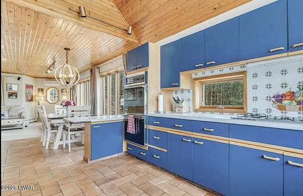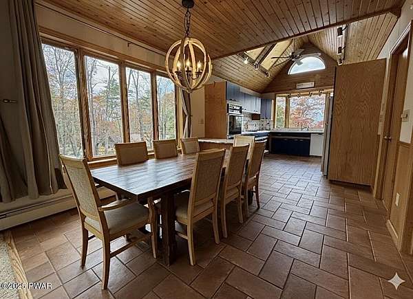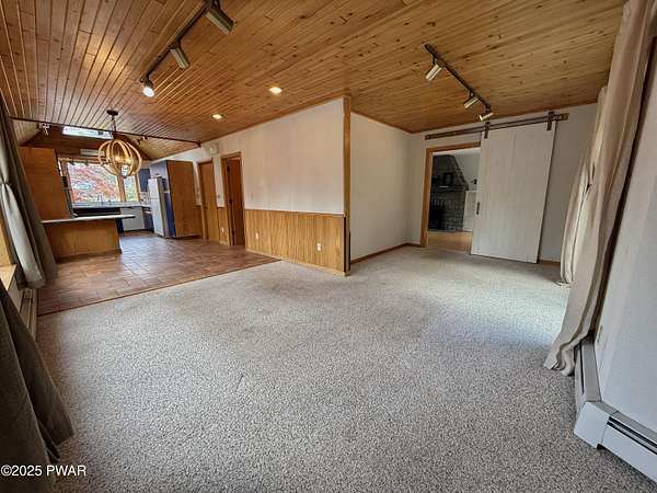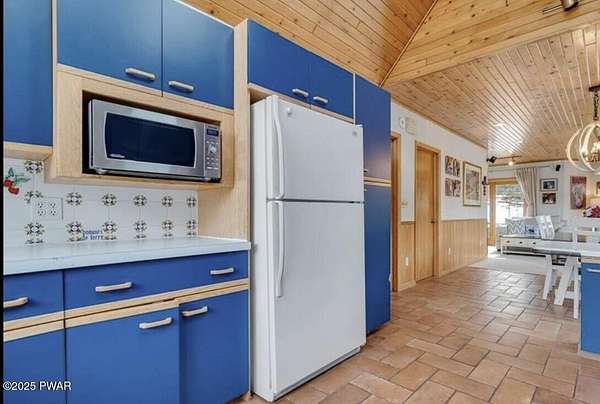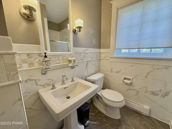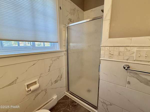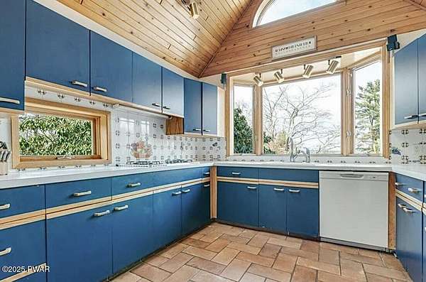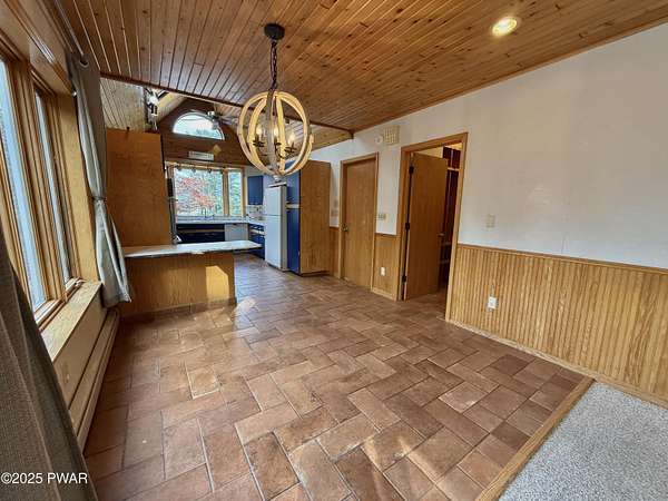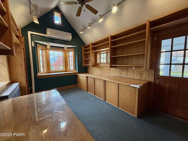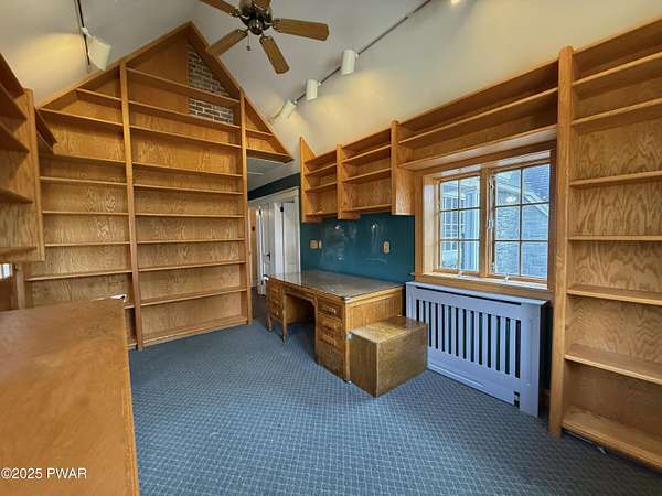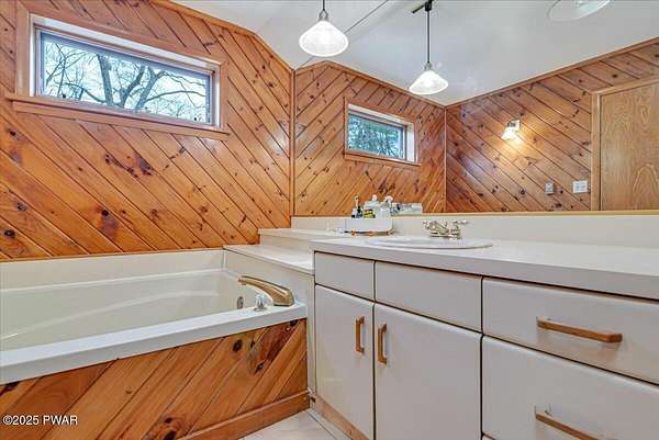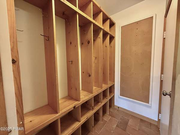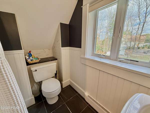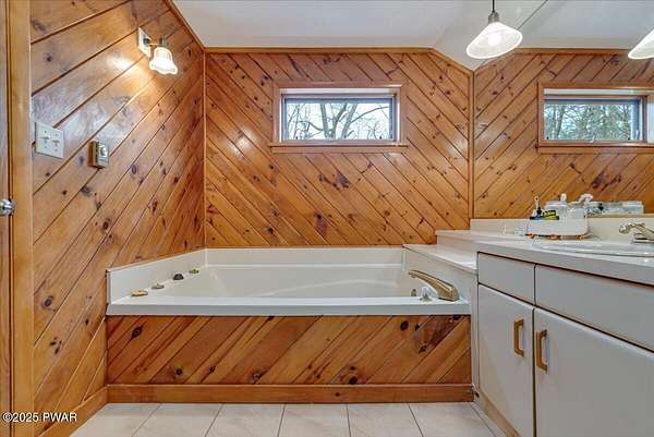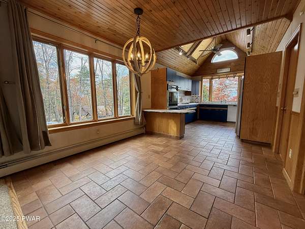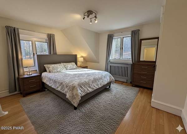 This amazing property offers it ALL - It sits outside of a community on 3.47 acres perched on top of the expansive front yard with seasonal views of Wallenpaupack! You will immediately admire the elegant, yet timeless bluestone stone exterior and long, private driveway.Imagine starting off your day cooking breakfast in your large kitchen with the view of your expansive private property. The kitchen and dining area feature beautiful tongue-and-groove ceilings, giving it that ''lake feel''. The dining area leads you through a county barn door to your bright living room, featuring an oversized stone fireplace with a remote-controlled propane insert that adds warmth and coziness to the living space. The original hardwood floors add even more character to this great space. You will appreciate the large windows throughout the home that fill every space with natural light. The expansive office features wooden built-in bookshelves, a 15-foot cathedral ceiling and a bay window, offering a perfect spot to relax or work in privacy! Also on the main level is a great playroom or dining room that can also be used as addition sleeping space. In between these two room is a full bathroom, complete with a tiled shower. On the second floor, you will find a primary bedroom with a spacious en-suite bathroom featuring a jacuzzi tub and a walk-in closet with wooden shelving. There should be no complaining of lack of storage space here! In addition to the walk-in closet, there are multiple cedar closets throughout the home. Just down the hall you will find 3 additional bedrooms and a beautiful third full bathroom with a tiles shower/tub combo.There are newly installed split units in each room ensuring you will be comfortable year-round. In addition, there is a stand-by Generac home generator, giving you ultimate peace of mind through every season.