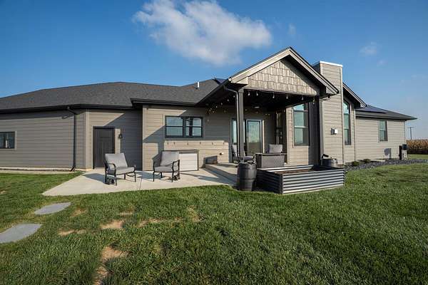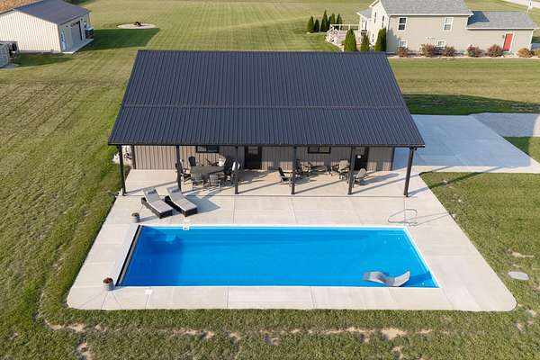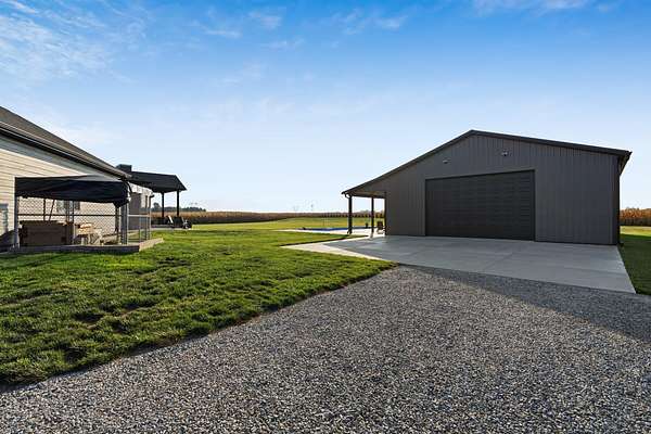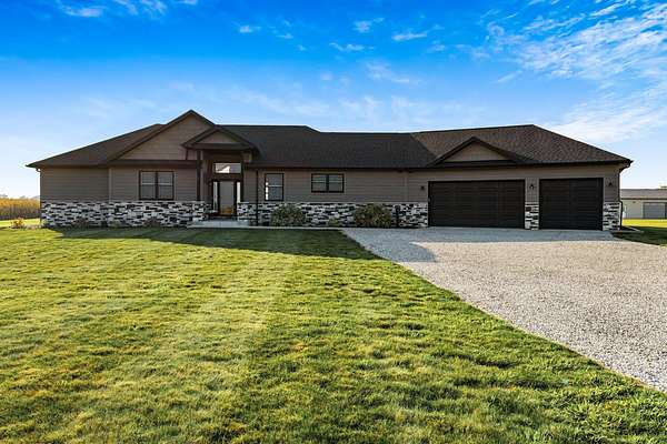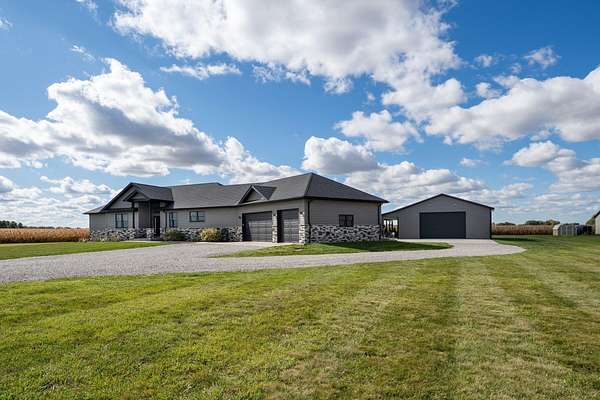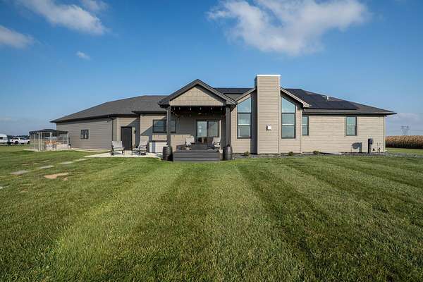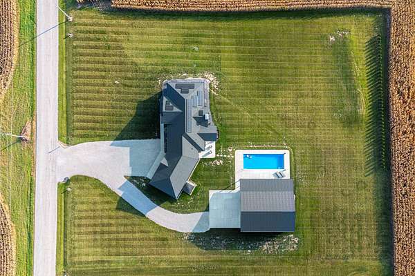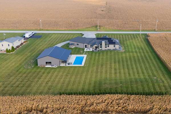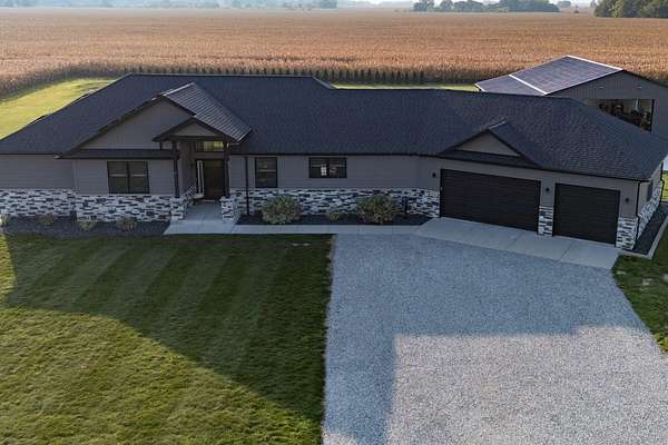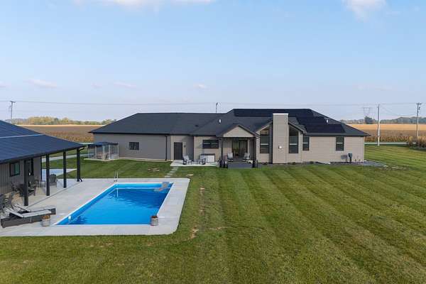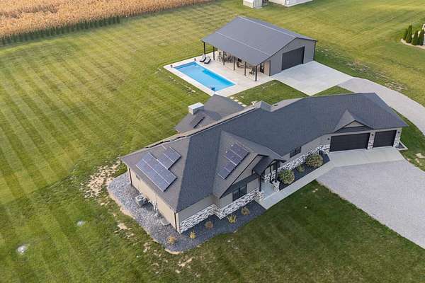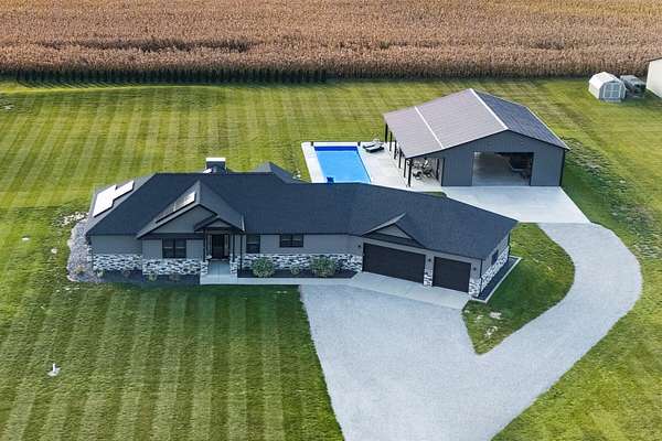 Stunning custom ranch offering 4 bedrooms, 3 baths, a main floor office, and over 3,500 sq ft of finished living space on 1.52 acres! Designed with modern efficiency and comfort in mind, this home includes SolarEdge solar panels with a 10kW backup battery (2023), a heated inground fiberglass pool (2024), and a new 36'x48' barn/pool house (2024). The exterior features LP SmartSide siding with stone accents, a covered front porch, and a covered back patio with an additional walkway leading to the garage. Inside, 9-foot ceilings run throughout the main level with vaulted ceilings in the living room and entryway. The open-concept layout offers spacious living and dining areas with custom cabinetry and shelving, a floor-to-ceiling stone fireplace with limestone mantel, and an inviting flow perfect for entertaining. The primary suite includes a walk-in closet, custom double vanity, and walk-in tile shower. The finished basement includes 9 ft. ceilings and features a large open entertaining area with a dry kitchenette, two bedrooms connected by a spacious walk-in closet, a beautiful bathroom with a walk-in tile shower, and a bonus room perfect for a playroom or exercise space. Additional highlights include an attached 3.5-car heated garage with 8' doors, EV charging capability, a dog wash in the spacious laundry room, 2x6 construction, a Kinetico water system, and a whole-house backup battery. Outdoors, enjoy your own private retreat with a 16'x40' pool featuring a tanning ledge and auto safety cover, plus a fully finished barn with spray foam insulation, cabinets, and a large covered porch. Experience the best of modern country living with space, style, and serenity--all right at home