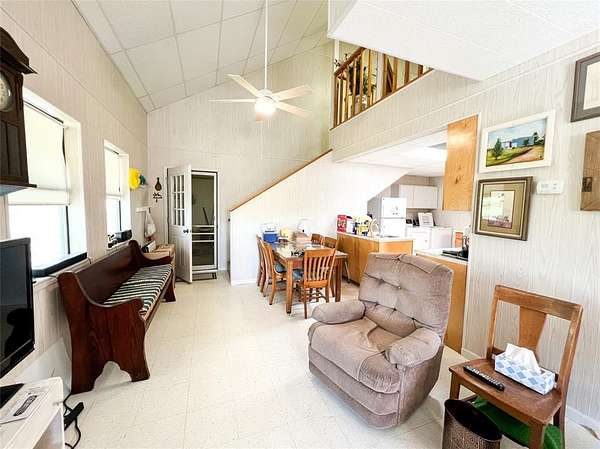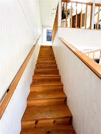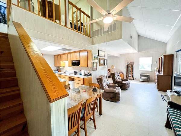 - Decorative Lighting, Eat-In Kitchen, Multiple Staircases, Natural Woodwork, Open Floorplan, Paneling, Vaulted Ceiling(s)