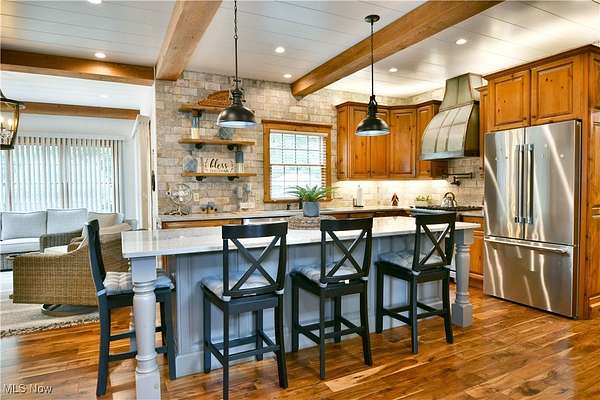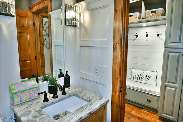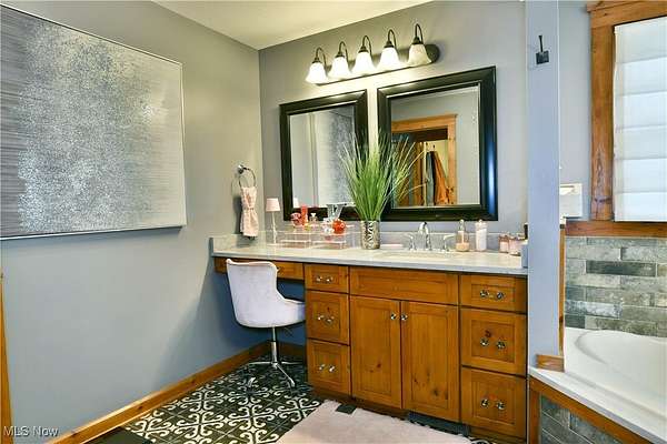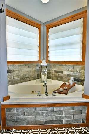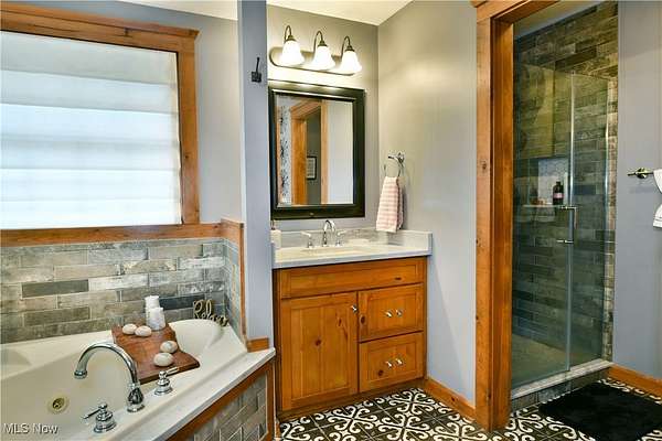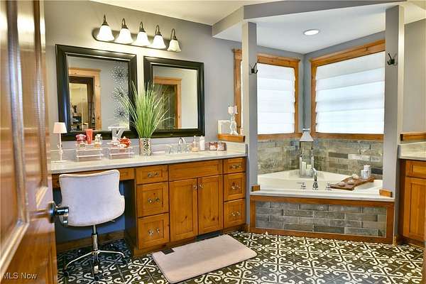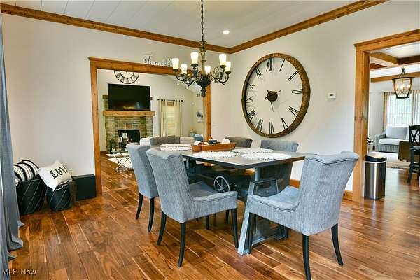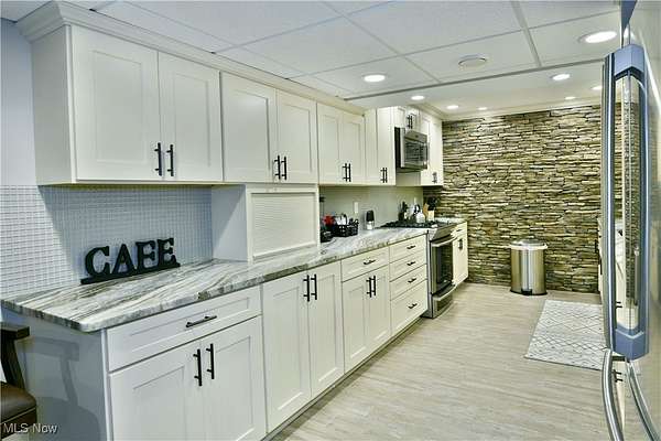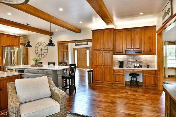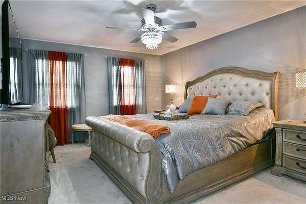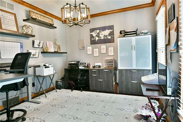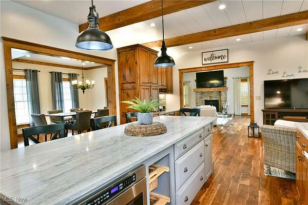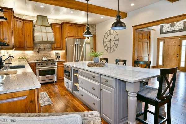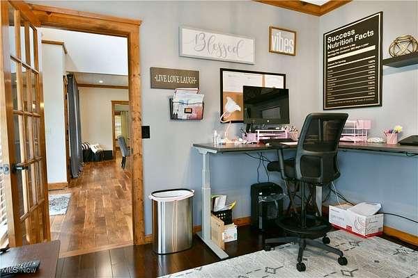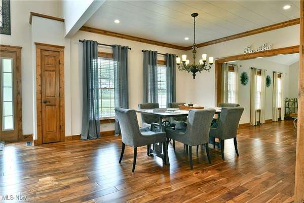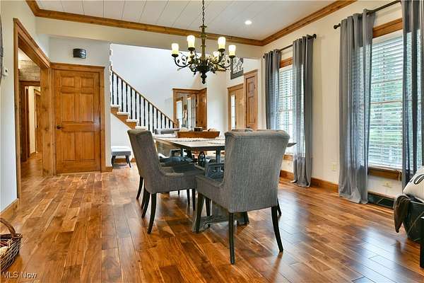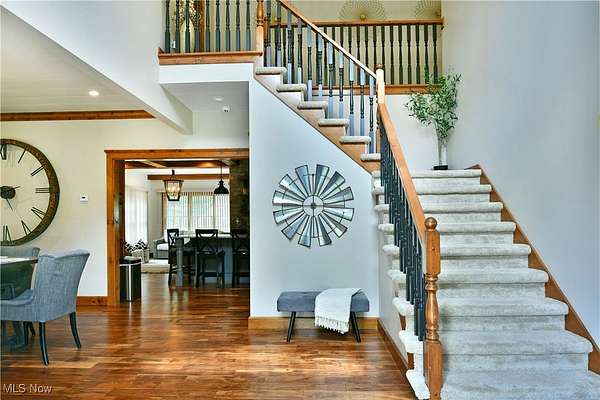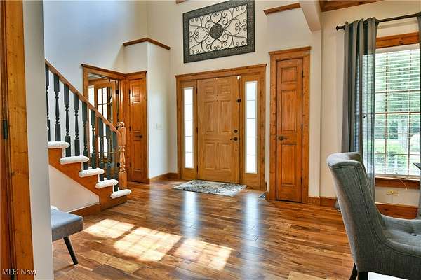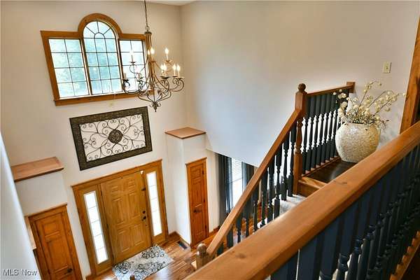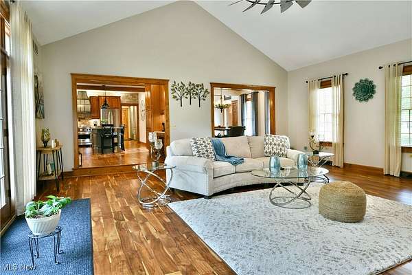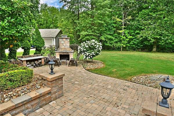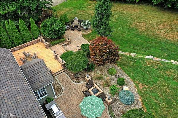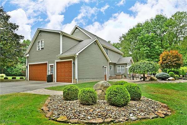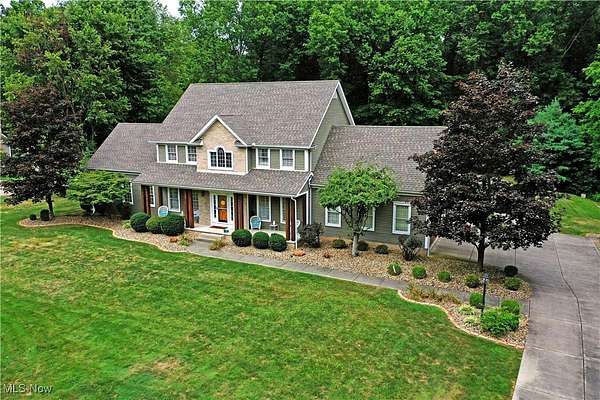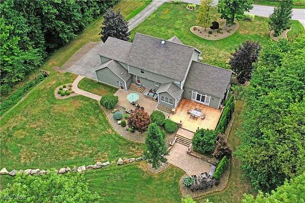 A visual masterclass in style, materials and more; this show stopping Canfield estate is set to take your breath away! Includes 2 lots with a total of almost 5 acres. Set deep within a highly desirable, private drive neighborhood, the expansive residence captivates from behind sculpted, rock bed landscaping to showcase its pillar lined and covered front porch. Arch topped windows grace the towering two story foyer as a cement drive wraps around to find a three-car garage. The stone walkway follows into an elaborate rear patio with tiered levels, inset grill and a lower chimenea where you can relax fireside at night. Step inside to find lavish woodwork and warm sunlight that filters through the tall windows. The carpeted staircase joins an immediate dining room as home office hides away opposite the foyer. Immerse yourself in the spacious living room where tall ceilings overlook the stone-lined fireplace. Overhead woodwork graces the must-see kitchen with its hooded Viking range, stone topped island, corner bar and onlooking sunroom-like lounge. Custom cabinets line the adjacent hall were an elegant half bath finds first floor laundry. Upstairs, don't miss the oversized master suite, accompanying walk-in closet and remarkable full bath with dual vanities, jetted tub and tiled stall shower. Three additional bedrooms include both an attached bath and a common, full second-floor bath. The far bedroom enjoys its own walk-in closet with lounge. The finished basement is built to entertain with a central family room, full kitchen, half bath and dining; plus rec space and a home gym with additional storage available.