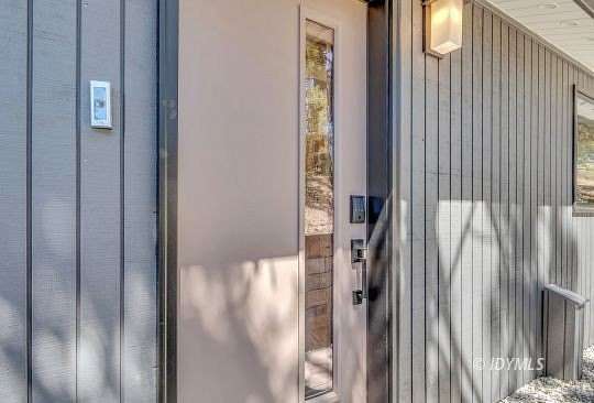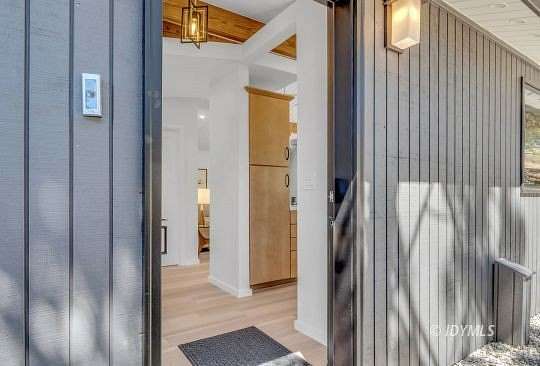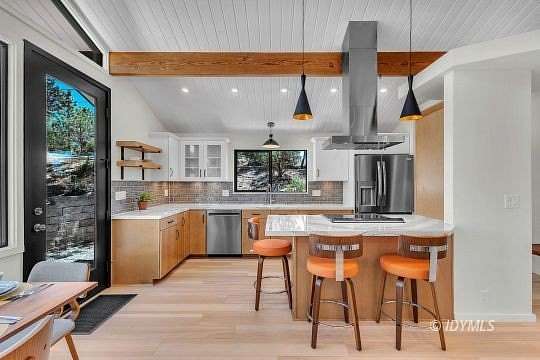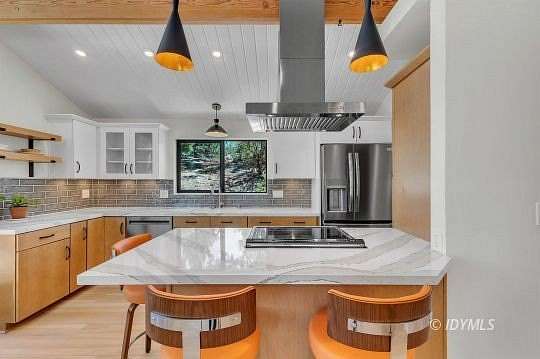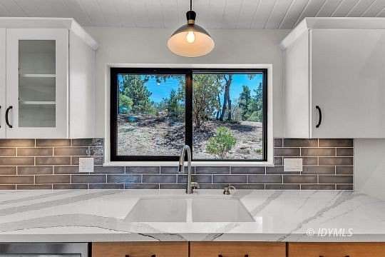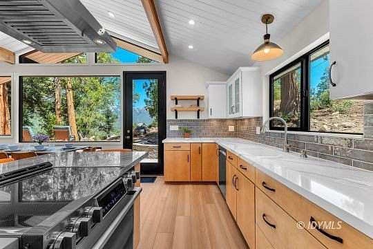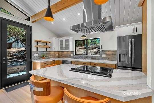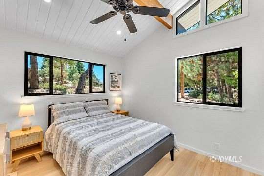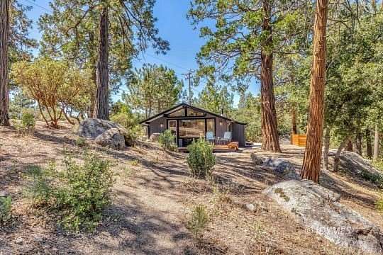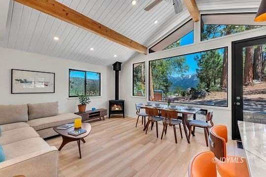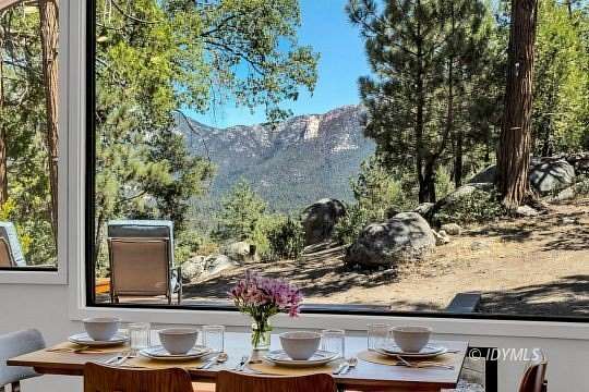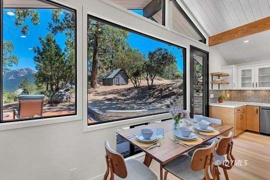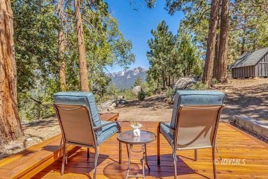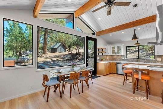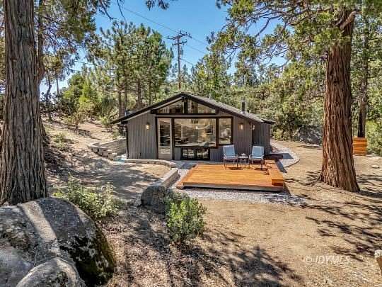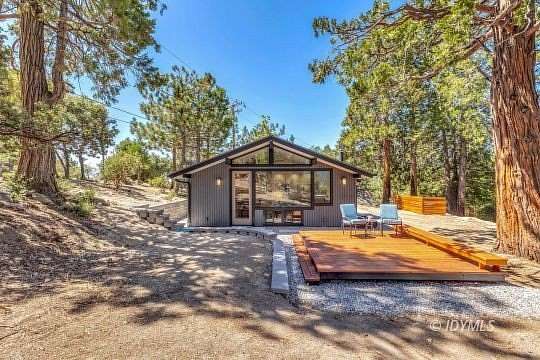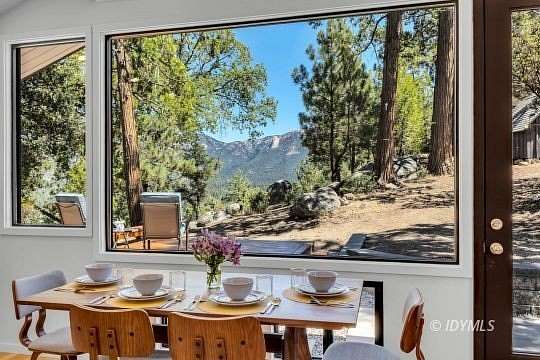 SIMPLY STUNNING REMODELED HOME ON 2 ACRES Located in the highly desirable upper Double View Dr. area, this completely remodeled home feels like a brand new house! Exhibiting a modern mid century feel with crisp and clean high style finishes, the sunlit washed open living/dining/kitchen is highlighted by beamed ceilings, dramatic picture windows with incredible views and access to a private view deck. Upscale components include luxury vinyl plank flooring, designer lighting, beautiful Cambria quartz counter tops, sparkling high end stainless appliances, gorgeous tile, free-standing Valor propane fireplace, black frame Low-E Milgard windows, central heat, A/C and separate laundry. There are 2 bedrooms, 1.75 baths, including primary suite with curbless glass enclosed shower and walk-in closet. Hand curated furniture, specifically chosen for each room, is included. Outside, a magical setting awaits, with 2 acres of privacy and breathtaking views of Tahquitz Peak, Lily Rock and the San Jacinto Mountains. Take the private trail to several dramatic vantage points, including your own "inspiration point" with stunning sunset views. Lots of room for future development.