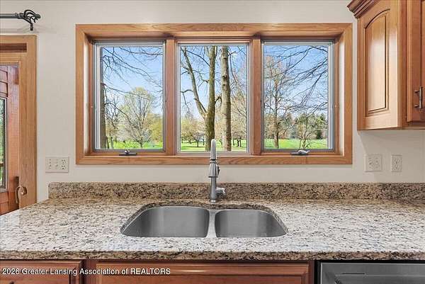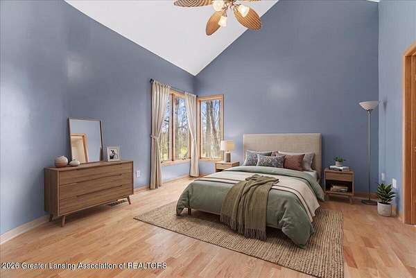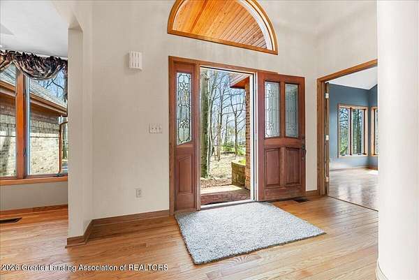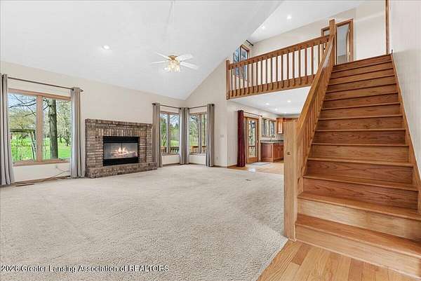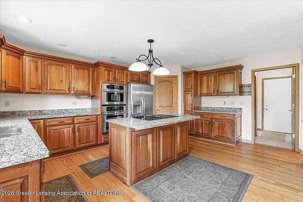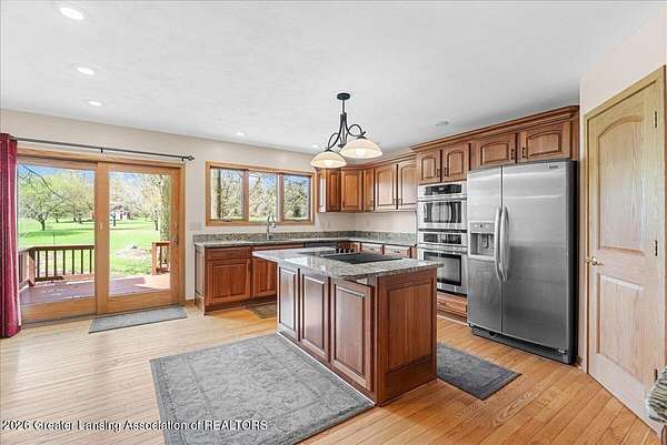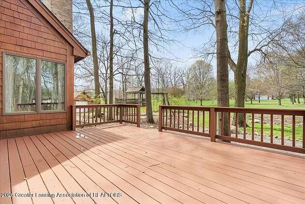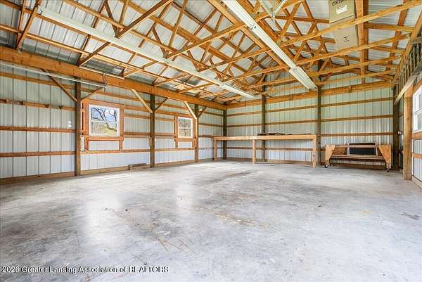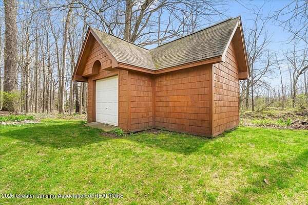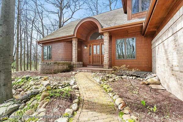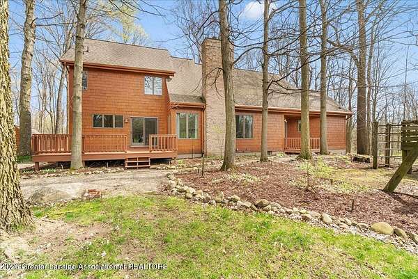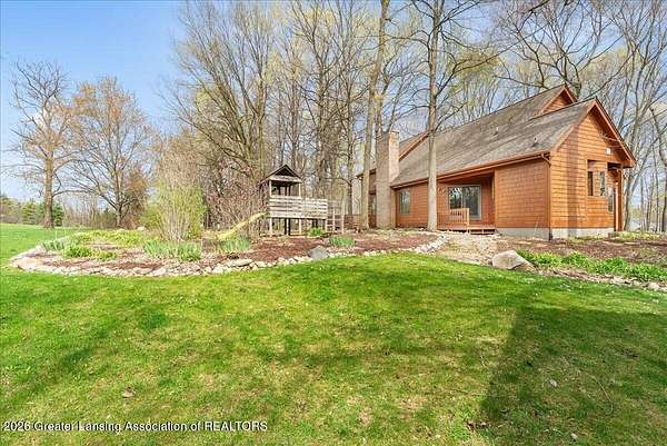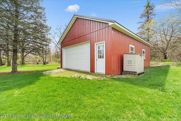 Welcome to 5262 N Canal Rd, this stunning one-owner home offers 5 bedrooms, 3.5 bathrooms, and a private setting surrounded by mature trees. From the moment you enter, you're greeted by a beautiful foyer with tall ceilings and an open, inviting layout. The updated kitchen flows seamlessly into the living area, featuring a wood-burning fireplace and access to a formal dining room, perfect for both everyday living and entertaining. The main-floor primary suite is truly impressive, offering a spacious en suite bath with a separate tub and shower, a large walk-in closet, and private access to its own deck. An additional bedroom on the main level provides flexibility for a guest room or office, along with first-floor laundry and a half bath. Upstairs, you'll find two bedrooms connected by a shared full bathroom, plus a versatile loft space ideal for a playroom or home office. The finished basement adds incredible space with a large family room, wet bar, an additional bedroom with an attached full bath and built-in desk, a utility room with workshop space, and ample storage. Outside, the property shines with a shed, an additional garage matching the home, and a large all-metal pole barn with concrete floors, wired for electricity. Enjoy the peaceful setting with a beautiful koi pond, play area, and a private, tree-lined yard. Additional features include hardwood flooring, cedar shake and brick exterior, generator plug, and a new furnace (2025).