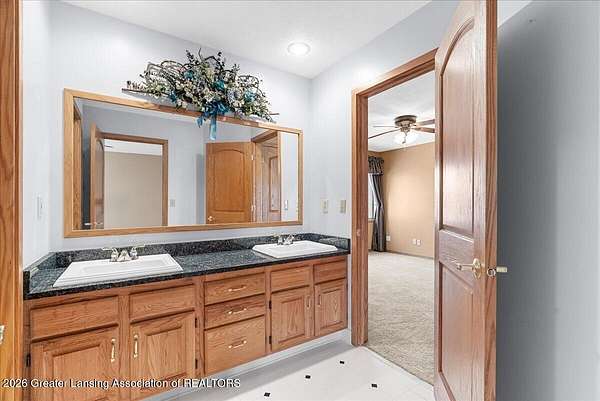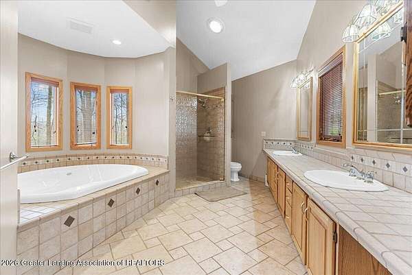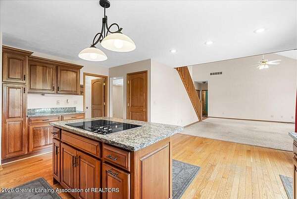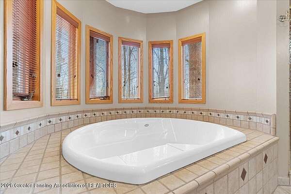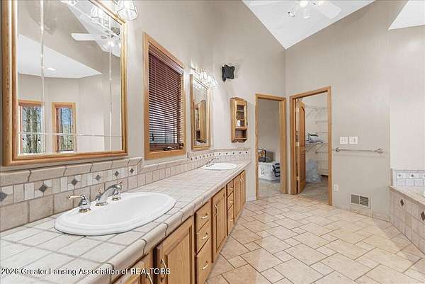 - Ceiling Fan(s), Double Vanity, Eat-In Kitchen, Entrance Foyer, Granite Counters, High Ceilings, In-Law Floorplan, Kitchen Island, Natural Woodwork, Open Floorplan, Pantry, Primary Downstairs, Soaking Tub, Vaulted Ceiling(s), Walk-In Closet(s), Wet Bar