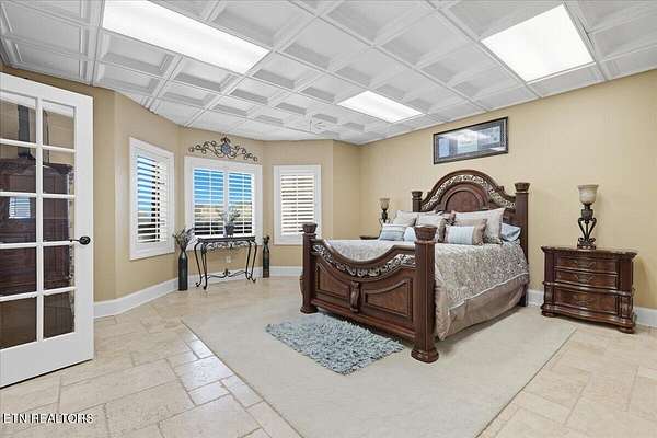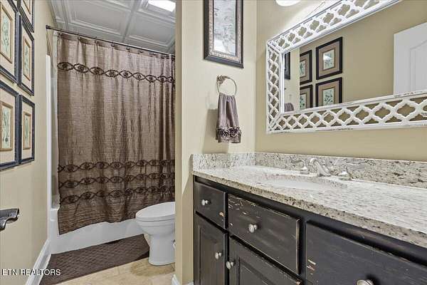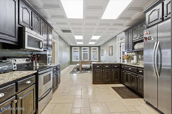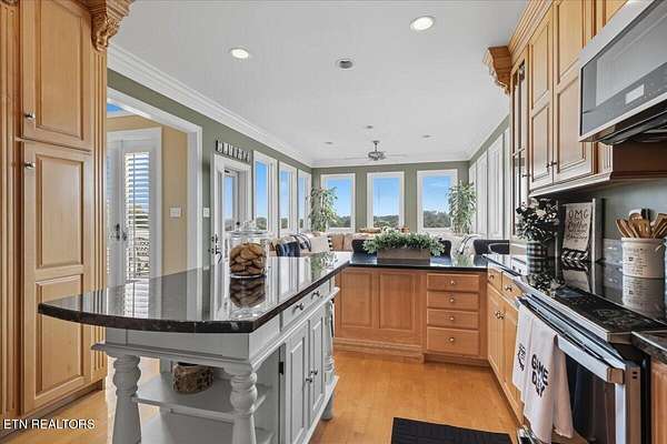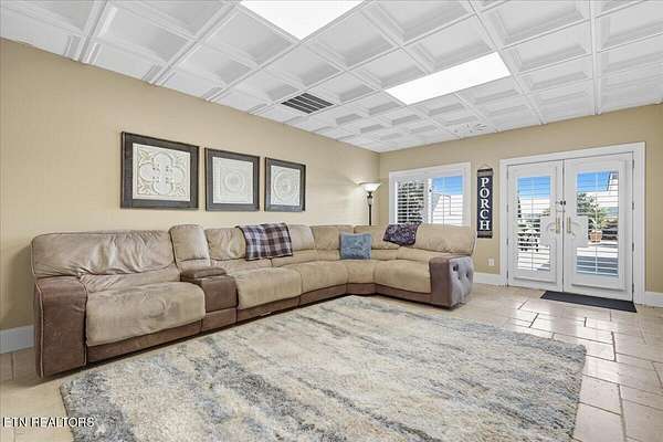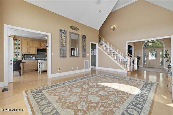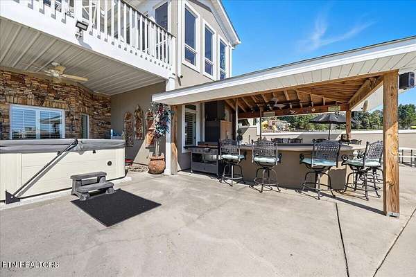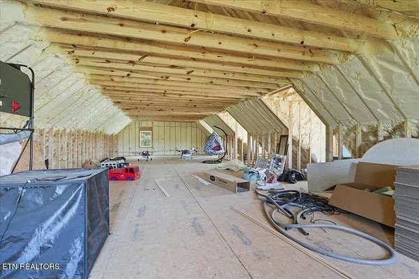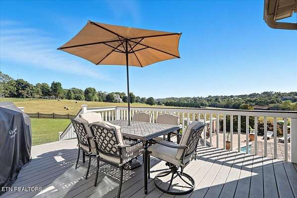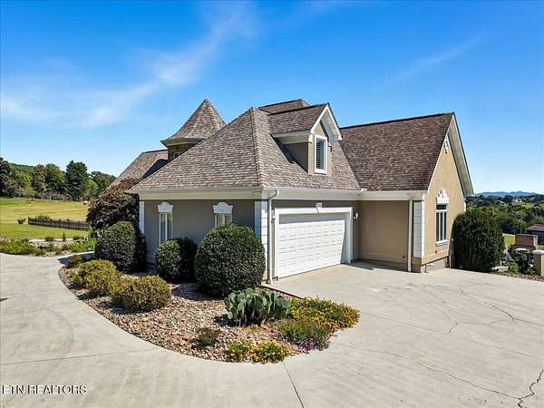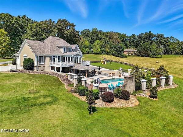 Discover your private sanctuary on 10 rolling acres with breathtaking views of Kahiti Golf Course and distant mountain vistas. This stunning home combines modern elegance with practical luxury, featuring beautiful stucco and stone exterior craftsmanship that catches the eye from every angle. The thoughtfully designed layout spans three levels, offering five spacious bedrooms and three and a half bathrooms. The main level showcases a grand primary bedroom with an oversized walk-in closet and spa-like bathroom featuring a garden jacuzzi tub and dual-head tiled shower. Rich hardwood floors flow throughout the open-concept living spaces, including a vaulted ceiling living room, expansive dining area, and sun room perfect for morning coffee while enjoying the scenic outlook. The lower level functions as a complete guest suite with full kitchen, living room, dining area, bedroom, and bathroom - ideal for extended family or rental income potential. Upstairs, three generous bedrooms share a well-appointed bathroom with dual vanities and convenient attic access. Outside, entertainment reaches new heights with a 20,000 gallon in-ground pool surrounded by an impressive courtyard featuring a U-shaped bar seating twelve guests, complete with full-size refrigerator and ice machine. An outdoor brick fireplace and decorative fountain create resort-style ambiance. Car enthusiasts, hobbyists, and wood workers will love the 2,700 square foot detached garage with climate control and spray foam insulation. The property offers 375 feet of road frontage on Niles Ferry and 700 feet on Mountain View, seasonal blackberry harvesting, and proximity to three Tellico Lake marinas within two miles. Your new East Tennessee retreat awaits you and your family!