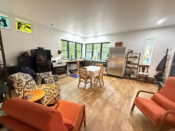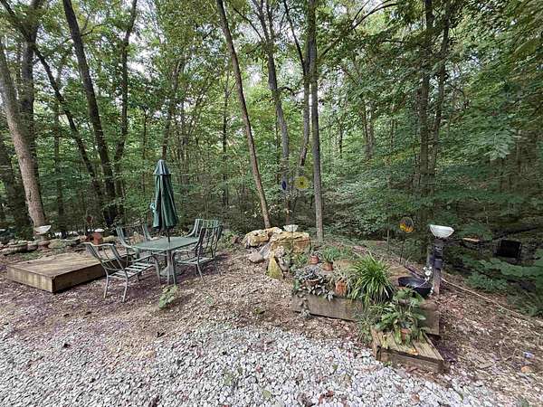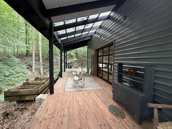 Custom-built home has beautiful surroundings with woodsy setting totaling 7.5 acres (double lot) and is an absolute showpiece! Artisan crafted, this home offers a sleek, modern, efficient design that makes an outstanding place to call home or could be a charming getaway. The home offers 2"x6" construction throughout. Custom windows, hardwood floors, industrial cabinetry add to the appeal. The modern glass garage door brings the woodsy views inside and one can enjoy the living space open air, if desired. Walk out to the expansive 'L-shaped' deck that is made from 1.25' native red cedar from Southern Indiana. Plenty of room for various seating that gives you a bird's eye view of the spring-fed creek and wildlife and even a space for a relaxing porch swing. The open concept makes great use of space, the 9ft ceilings and various windows add to the natural light and the appeal of the home. The home was thoughtfully designed for not only its visual appeal, but its energy efficiency. The home has rockwool insulation, foam insulation and have an R30 value in the exterior walls and air sealing of the structure was done to zip the system. The ceiling has 18" of cellulose insulation for an R60 value. The home stays temperate inside and the Envi Smart heater and window air conditioner both provide ample cooling and heating when needed. There is a French drain from the southwest corner of the home to Blue Heron Road. This home does offer a double lot. So much to love at this contemporary home!